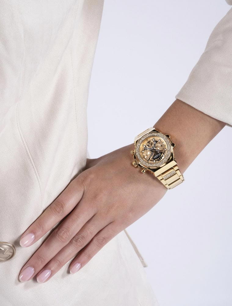 Женские наручные часы Guess Sport Steel GW0552L2 с минеральным стекломМинеральное стеклоМинеральное стекло представляет собой искусственно выращенный минерал кварца. Такое стекло отличается особой устойчивостью к повреждениям и царапинам. Уступает по некоторым качествам сапфировому стеклу., кварцевый механизм с высокой точностью. 24-х часовой формат времени, число и день недели отображаются на отдельных циферблатах. Стрелки и метки с люминесцентным покрытиемЛюминесцентное покрытиеПозволяет считывать показания времени в темноте. Производители наносят на стрелки, часовые индексы, безель или поверхность циферблата светонакопительный состав, дающий холодное свечение.. Класс водозащиты: 50 метров, позволит защитить корпус от случайных брызг или капель дождя. Корпус часов и браслет изготовлены из стали с IP-покрытиемIP-покрытиеМетод ионного напыления. Демонстрирует повышенную устойчивость к истиранию, окислению и химическим веществам. Под воздействием высокого давления и температуры около 1500°C молекулы металла надёжно соединяются с частицами корпуса часов.. БезельБезельВнешний ободок, закрепляющий стекло. В спортивных часах так называется поворотное кольцо с делениями на циферблате, выполняет роль таймера – замеряет отрезки времени на шкале. Неподвижный безель – элемент декора. Однонаправленно вращающийся безель на дайверских часах позволяет фиксировать моменты погружения и выныривания на поверхность. инкрустирован кристаллами. Браслет с раскладной застёжкойРаскладная застёжкаТакой тип застёжки используется только на браслетах из металла. Она никогда не раскрывается полностью, происходит разделение на 2 и более частей. Раскладывающая застёжка снизит вероятность потери часов к минимуму..