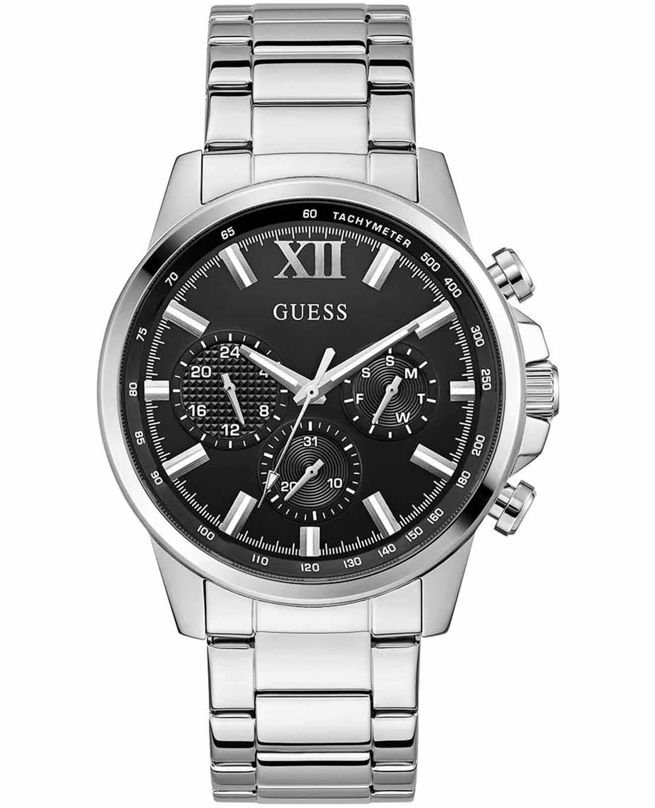 Стильные и функциональные часы Guess GW0900G1 оснащены кварцевым механизмом, что обеспечивает точность и надежность в использовании. Корпус выполнен из прочной стали с полированной поверхностью, придающей изделиям утонченный и современный вид. Черный циферблат украшен метками в виде штрихов и римской цифрой XII, обеспечивающими легкое считывание времени. Время отображается в двух форматах — 12-ти и 24-х часовом, что удобно для тех, кто привык к разным системам времени. Дополнительные циферблаты показывают дату и день недели, что позволяет всегда быть в курсе текущей даты без необходимости использования других устройств. Часы также оснащены тахиметромТахиметрРазмеченная шкала, располагается на ободке или безеле часов. Тахиметр позволяет рассчитать скорость на определённом участке пути, расстояние измеряется в километрах или милях., что добавляет им функциональности и может быть полезно для измерения скорости. Люминесцентное покрытиеЛюминесцентное покрытиеПозволяет считывать показания времени в темноте. Производители наносят на стрелки, часовые индексы, безель или поверхность циферблата светонакопительный состав, дающий холодное свечение. на стрелках и метках обеспечивает отличную видимость в темноте. Минеральное стеклоМинеральное стеклоМинеральное стекло представляет собой искусственно выращенный минерал кварца. Такое стекло отличается особой устойчивостью к повреждениям и царапинам. Уступает по некоторым качествам сапфировому стеклу. защищает циферблат от царапин и повреждений, а водозащита 50WR позволяет не волноваться о случайных контактах с водой, например, во время дождя. Браслет из стали оснащен раскладной застежкойРаскладная застёжкаТакой тип застёжки используется только на браслетах из металла. Она никогда не раскрывается полностью, происходит разделение на 2 и более частей. Раскладывающая застёжка снизит вероятность потери часов к минимуму., обеспечивающей надежную фиксацию часов на руке и комфорт в ношении. Рифленая заводная головка с защитой добавляет изысканности и одновременно защищает механизм от повреждений. Эти часы идеально подойдут для тех, кто ценит стиль, функциональность и качество в одном аксессуаре.