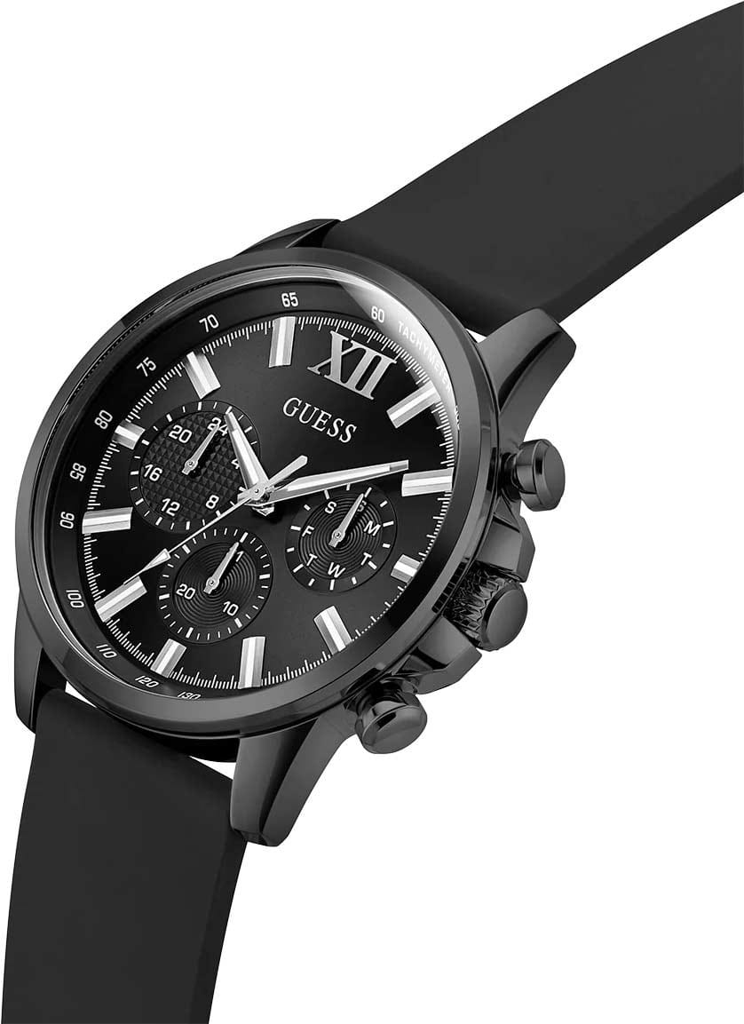 Стильные и функциональные часы Guess GW0913G3 оснащены кварцевым механизмом, что обеспечивает точность и надежность в использовании. Корпус выполнен из прочной стали с черным IP-покрытиемIP-покрытиеМетод ионного напыления. Демонстрирует повышенную устойчивость к истиранию, окислению и химическим веществам. Под воздействием высокого давления и температуры около 1500°C молекулы металла надёжно соединяются с частицами корпуса часов., придающей изделиям утонченный и современный вид. Черный циферблат украшен метками в виде штрихов и римской цифрой XII, обеспечивающими легкое считывание времени. Время отображается в двух форматах — 12-ти и 24-х часовом, что удобно для тех, кто привык к разным системам времени. Дополнительные циферблаты показывают дату и день недели, что позволяет всегда быть в курсе текущей даты без необходимости использования других устройств. Часы также оснащены тахиметромТахиметрРазмеченная шкала, располагается на ободке или безеле часов. Тахиметр позволяет рассчитать скорость на определённом участке пути, расстояние измеряется в километрах или милях., что добавляет им функциональности и может быть полезно для измерения скорости. Люминесцентное покрытиеЛюминесцентное покрытиеПозволяет считывать показания времени в темноте. Производители наносят на стрелки, часовые индексы, безель или поверхность циферблата светонакопительный состав, дающий холодное свечение. на стрелках и метках обеспечивает отличную видимость в темноте. Минеральное стеклоМинеральное стеклоМинеральное стекло представляет собой искусственно выращенный минерал кварца. Такое стекло отличается особой устойчивостью к повреждениям и царапинам. Уступает по некоторым качествам сапфировому стеклу. защищает циферблат от царапин и повреждений, а водозащита 50WR позволяет не волноваться о случайных контактах с водой, например, во время дождя. Силиконовый черный ремешок с классической застежкой обеспечивает надежную фиксацию часов на руке и комфорт в ношении. Рифленая заводная головка с защитой добавляет изысканности и одновременно защищает механизм от повреждений. Эти часы идеально подойдут для тех, кто ценит стиль, функциональность и качество в одном аксессуаре.