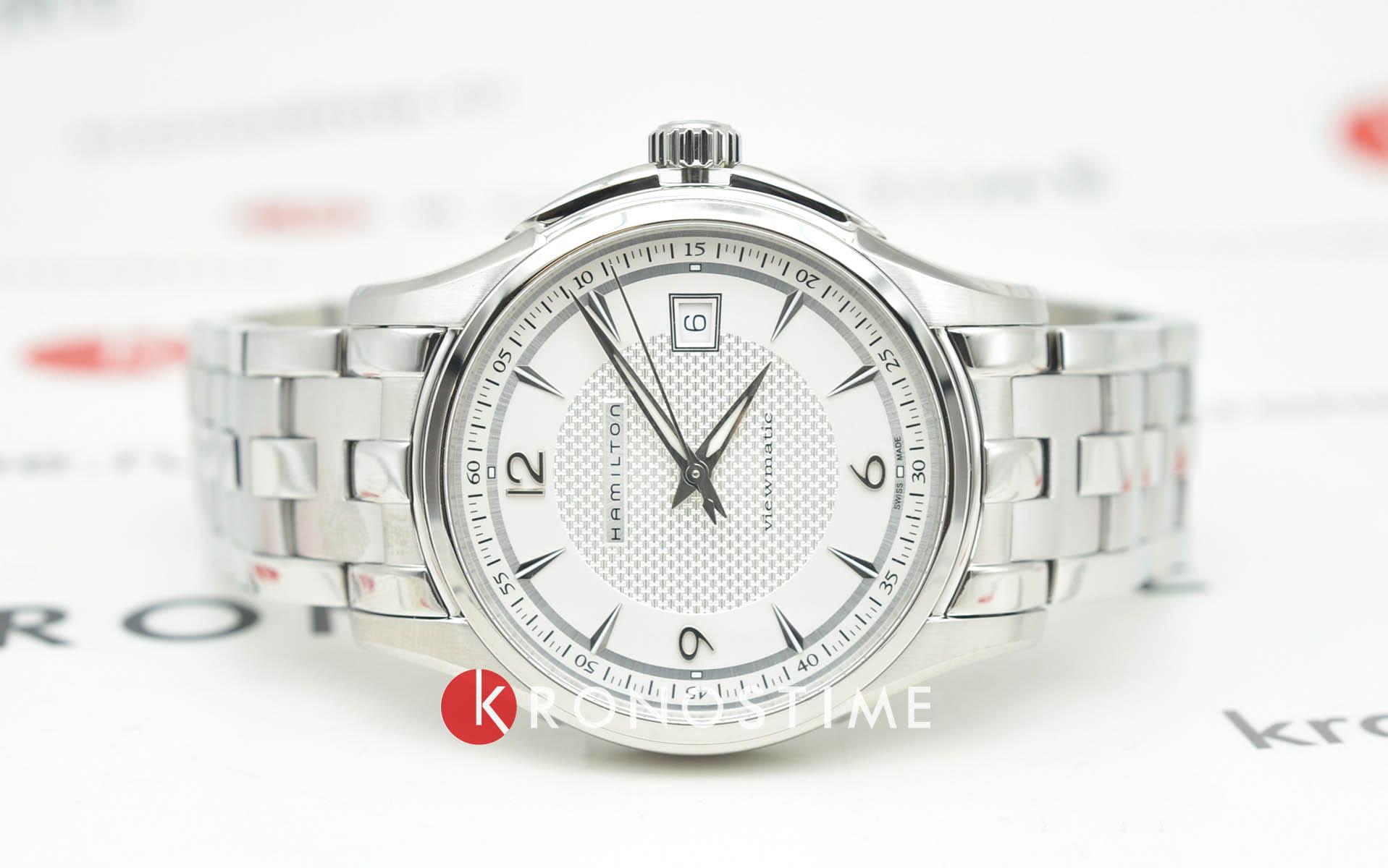 Мужские наручные часы Hamilton Jazzmaster Viewmatic Auto H32515155 с автоматическим механизмом. Корпус часов выполнен из нержавеющей стали. Стальной браслет на застёжке-бабочке с кнопкамиЗастёжка "бабочка"Такой вид застёжки дополняется предохранителями, помогающими избежать случайного раскрытия браслета. Обладают изящным исполнением. . Стрелки и метки с люминесцентным покрытиемЛюминесцентное покрытиеПозволяет считывать показания времени в темноте. Производители наносят на стрелки, часовые индексы, безель или поверхность циферблата светонакопительный состав, дающий холодное свечение.. Сапфировое стеклоСапфировое стеклоПрочный и надёжный материал из кристалла сапфира синтетического происхождения, характеризующийся особой твёрдостью и устойчивостью к царапинам и повреждениям. с антибликовым покрытием. Уровень влагозащиты: 50 метров, позволит защитить корпус от случайных брызг или капель дождя. Окошко даты находится в положении 3 часа.