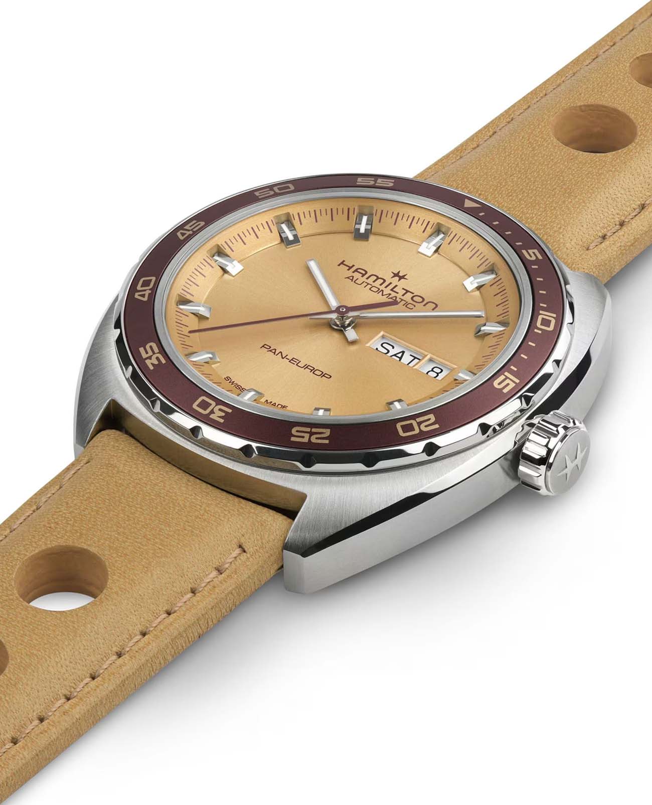 Мужские часы Hamilton American Classic Pan Europ Day Date Auto H35435820. Механизм с автоматическим подзаводом Сапфировое стеклоСапфировое стеклоПрочный и надёжный материал из кристалла сапфира синтетического происхождения, характеризующийся особой твёрдостью и устойчивостью к царапинам и повреждениям. устойчивое к появлению царапин, обладающее высокой прозрачностью. Класс водозащиты: 50 метров, позволит защитить корпус от случайных брызг или капель дождя. Корпус часов изготовлен из нержавеющей стали. Кожаный ремешок с раскладной застёжкойРаскладная застёжкаТакой тип застёжки используется только на браслетах из металла. Она никогда не раскрывается полностью, происходит разделение на 2 и более частей. Раскладывающая застёжка снизит вероятность потери часов к минимуму.. БезельБезельВнешний ободок, закрепляющий стекло. В спортивных часах так называется поворотное кольцо с делениями на циферблате, выполняет роль таймера – замеряет отрезки времени на шкале. Неподвижный безель – элемент декора. Однонаправленно вращающийся безель на дайверских часах позволяет фиксировать моменты погружения и выныривания на поверхность. с PVD-покрытиемPVDУльтратонкое покрытие наносится в технике вакуумного напыления, сочетает в себе нитрид титана особой прочности со слоем золота или оксида хрома. Несёт в себе декоративную или защитную функцию.. В комплект входит сменный тканевый ремешок. Стрелки и метки с люминесцентным покрытиемЛюминесцентное покрытиеПозволяет считывать показания времени в темноте. Производители наносят на стрелки, часовые индексы, безель или поверхность циферблата светонакопительный состав, дающий холодное свечение..