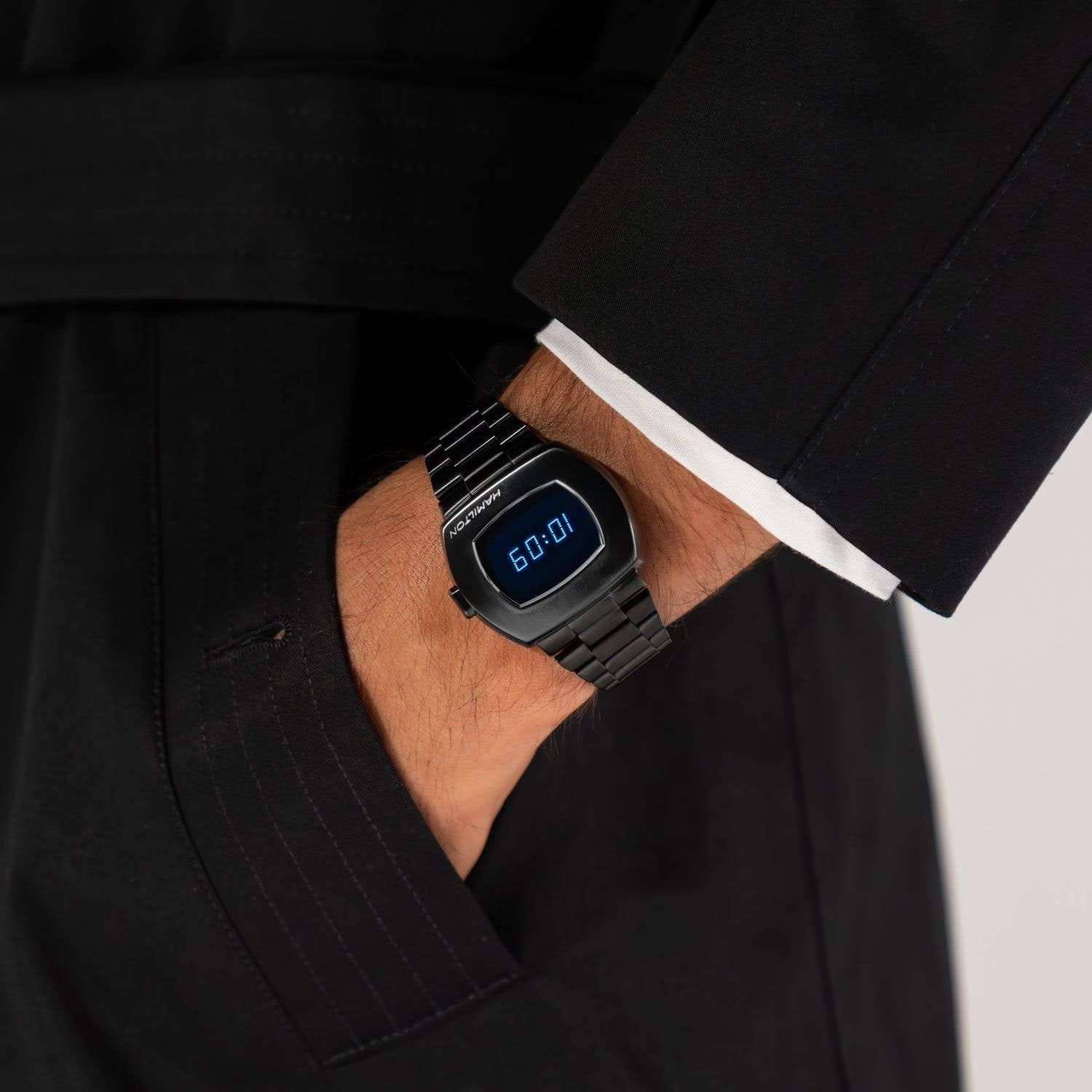 Hamilton PSR Digital Quartz H52404131 — культовая цифровая модель в современном исполнении с характерной атмосферой 70-х и минималистичной функциональностью. Корпус размерами 41 × 35 мм выполнен из нержавеющей стали с PVD-покрытиемPVDУльтратонкое покрытие наносится в технике вакуумного напыления, сочетает в себе нитрид титана особой прочности со слоем золота или оксида хрома. Несёт в себе декоративную или защитную функцию. чёрного цвета, что придаёт часам выразительный и технологичный вид. Гибридный дисплей сочетает постоянную LCD-индикацию и активируемую LED-подсветку, отображающую яркие синие цифры при нажатии кнопки. Циферблат защищён сапфировым стекломСапфировое стеклоПрочный и надёжный материал из кристалла сапфира синтетического происхождения, характеризующийся особой твёрдостью и устойчивостью к царапинам и повреждениям. с антибликовым покрытиемАнтибликовое покрытиеСлой оксида металла в 0,13-0,3 микрон, благодаря которому стекло часов не бликует и не отражает свет. Антибликовое покрытие уменьшает отражение света в 10 раз, обеспечивая отличную читаемость показателей циферблата., устойчивым к царапинам. Модель оснащена точным кварцевым механизмом, поддерживающим отображение времени и даты с возможностью выбора формата 12/24 часа. Браслет из нержавеющей стали с чёрным PVD-покрытиемPVDУльтратонкое покрытие наносится в технике вакуумного напыления, сочетает в себе нитрид титана особой прочности со слоем золота или оксида хрома. Несёт в себе декоративную или защитную функцию. и крупными звеньями дополнен застёжкой 'бабочка'Застёжка "бабочка"Такой вид застёжки дополняется предохранителями, помогающими избежать случайного раскрытия браслета. Обладают изящным исполнением. , обеспечивающей комфортную посадку и надёжную фиксацию. Водонепроницаемость 100 метров делает часы подходящими для повседневного ношения и плавания. Hamilton PSR H52404131 — это цифровой стиль в знаковом корпусе с современной начинкой.