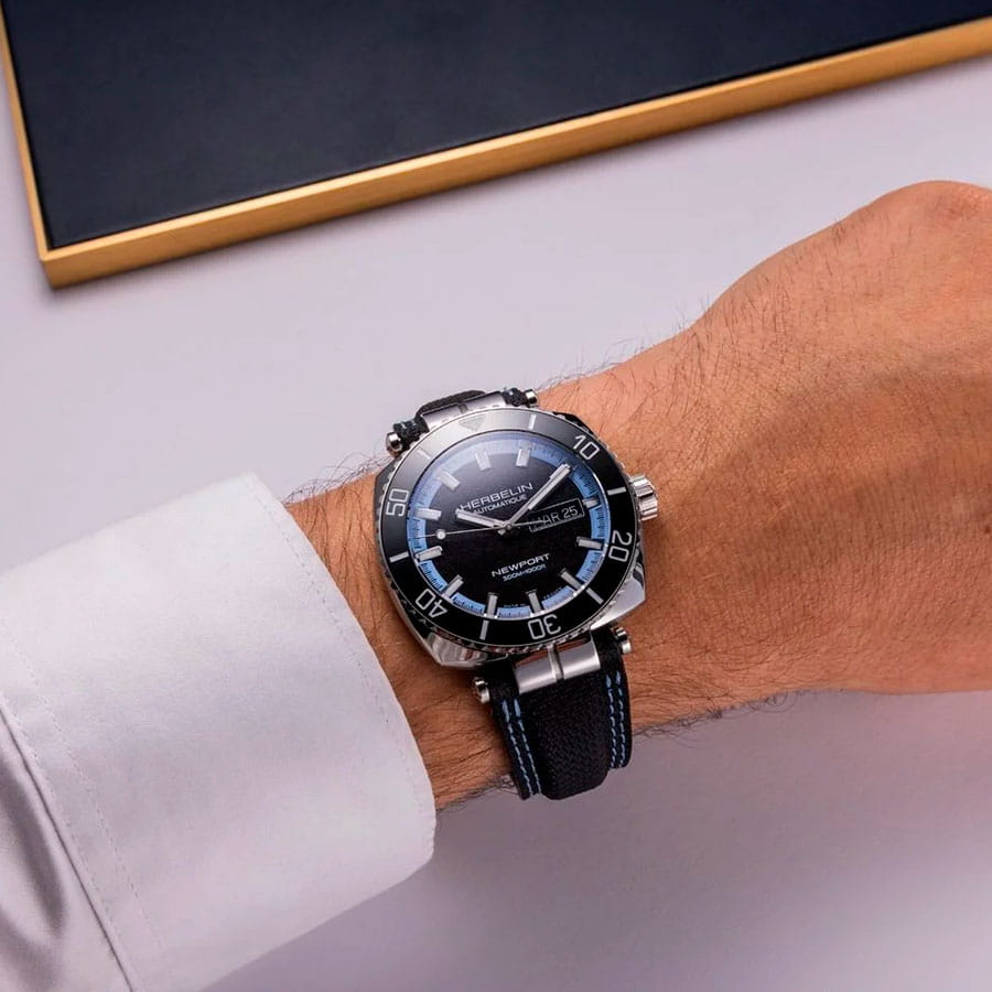 Мужские механические часы с автоподзаводом Herbelin Newport 1774AN154 – отражающий идеальное сочетание современного дизайна, надёжности и функциональности. Элегантный облик станет превосходным завершением образа, наделив его индивидуальным характером. Корпус из нержавеющей стали серебристого цвета, диаметром 42 мм, идеально сбалансирован и элегантен. Сапфировое стеклоСапфировое стеклоПрочный и надёжный материал из кристалла сапфира синтетического происхождения, характеризующийся особой твёрдостью и устойчивостью к царапинам и повреждениям. защищает циферблат от царапин и устойчивое к механическим повреждениям. Керамический безельБезельВнешний ободок, закрепляющий стекло. В спортивных часах так называется поворотное кольцо с делениями на циферблате, выполняет роль таймера – замеряет отрезки времени на шкале. Неподвижный безель – элемент декора. Однонаправленно вращающийся безель на дайверских часах позволяет фиксировать моменты погружения и выныривания на поверхность.. Окошко даты находится в положении 3 часа. Стрелки и метки с люминесцентным покрытиемЛюминесцентное покрытиеПозволяет считывать показания времени в темноте. Производители наносят на стрелки, часовые индексы, безель или поверхность циферблата светонакопительный состав, дающий холодное свечение.. Нейлоновый ремешок на застёжке-бабочке с кнопкамиЗастёжка "бабочка"Такой вид застёжки дополняется предохранителями, помогающими избежать случайного раскрытия браслета. Обладают изящным исполнением. обеспечивает комфортное ношение. Водозащита 300 метров позволит плавать, нырять и заниматься другими водными видами спорта. Эта модель – отличный выбор для тех, кто ищет сочетание стиля, качества и функциональности. Часы станут не только полезным аксессуаром, но и выразительным элементом вашего имиджа.