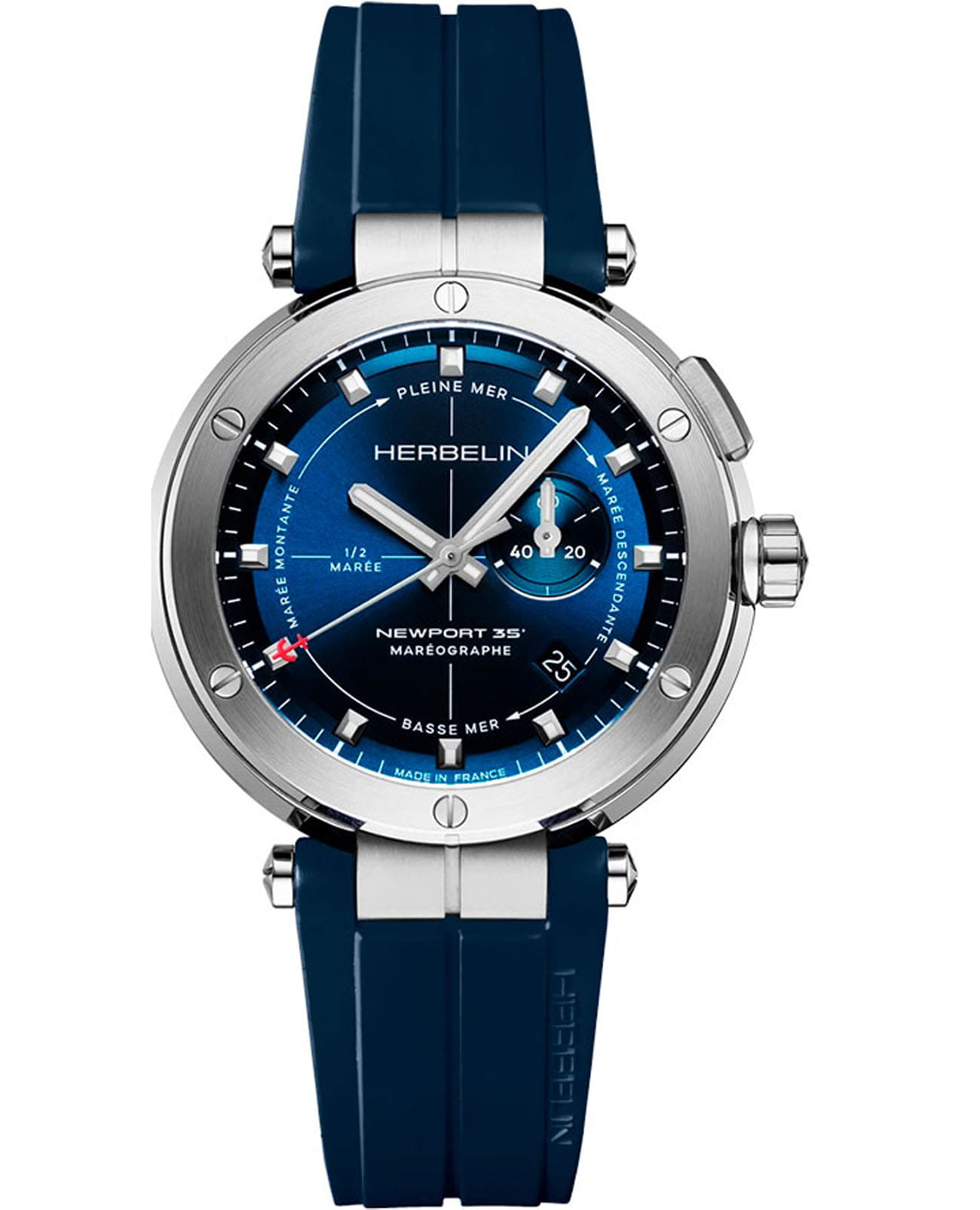 Мужские кварцевые часы Herbelin Newport Mareograph 24688A15CB – отражающий идеальное сочетание современного дизайна, надёжности и функциональности. Элегантный облик станет превосходным завершением образа, наделив его индивидуальным характером. Корпус из нержавеющей стали 316L серебристого цвета идеально сбалансирован и элегантен. Сапфировое стеклоСапфировое стеклоПрочный и надёжный материал из кристалла сапфира синтетического происхождения, характеризующийся особой твёрдостью и устойчивостью к царапинам и повреждениям. защищает циферблат от царапин и устойчивое к механическим повреждениям. Серая стрелка с красным кончиком указывает на прилив или отлив согласно показаниям внизу. Кнопка в положении «2 часа» управляет стрелкой индикатора прилива. Окошко даты находится в положении между 4 и 5 часами. Стрелки и метки с люминесцентным покрытиемЛюминесцентное покрытиеПозволяет считывать показания времени в темноте. Производители наносят на стрелки, часовые индексы, безель или поверхность циферблата светонакопительный состав, дающий холодное свечение., обеспечивающим хорошую читаемость в темноте. Синий каучуковый ремешок на застёжке-бабочке с кнопкамиЗастёжка "бабочка"Такой вид застёжки дополняется предохранителями, помогающими избежать случайного раскрытия браслета. Обладают изящным исполнением.  обеспечивает комфортное ношение. Водозащита 100 метров, позволит плавать, нырять и заниматься другими водными видами спорта. Эта модель – отличный выбор для тех, кто ищет сочетание стиля, качества и функциональности. Часы станут не только полезным аксессуаром, но и выразительным элементом вашего имиджа.