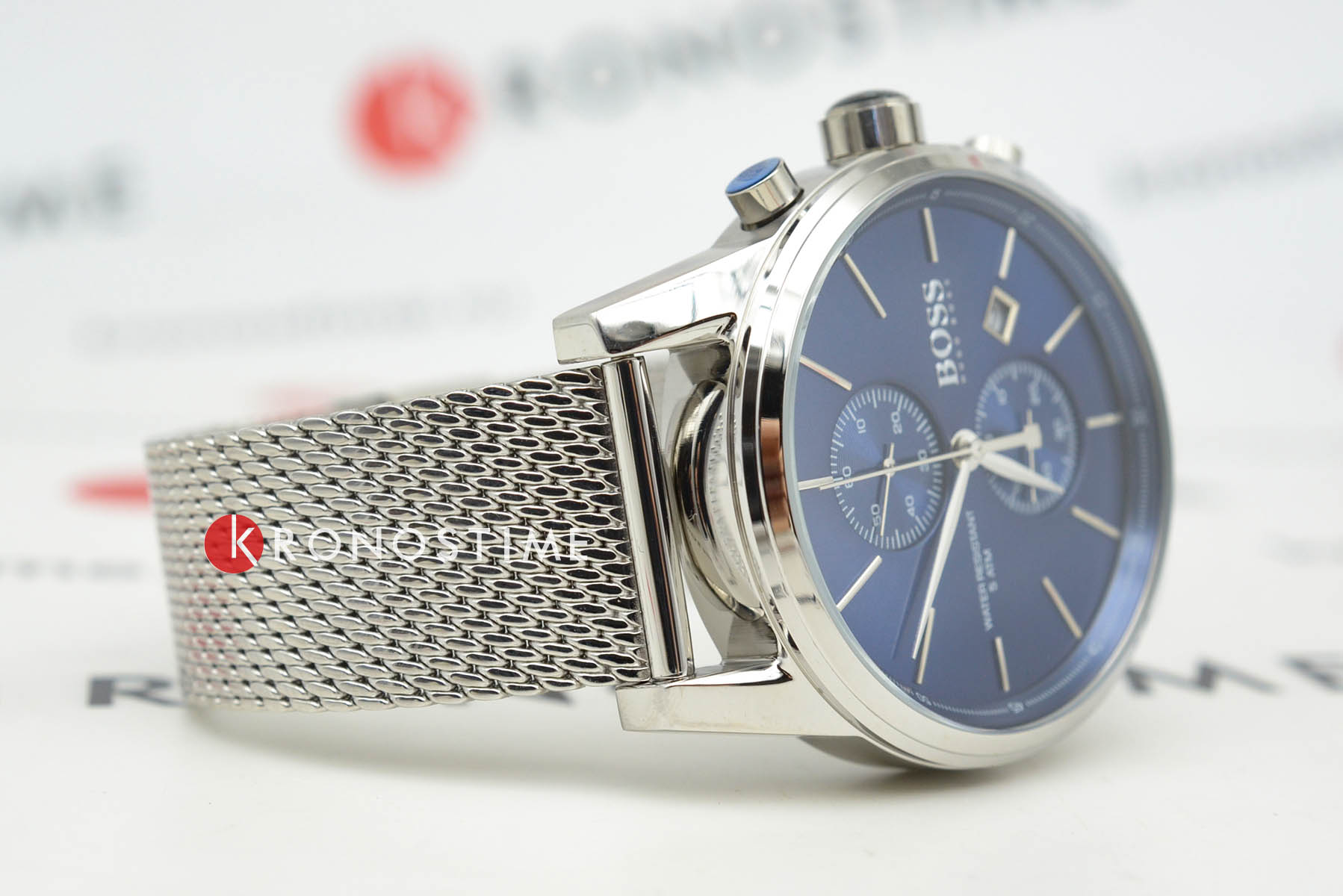 Мужские кварцевые часы Hugo Boss Jet HB1513441 представлены в 40-мм корпусе из нержавеющей стали серебристого цвета. Модель оснащена кварцевым механизмом с функцией хронографаХронографФункция позволяет измерять отрезки времени с особой точностью: часы, минуты, секунды. Верным признаком хронографа является наличие на циферблате 3 дополнительных окошек-счётчиков. и секундомеромСекундомерСекундоме́р — прибор, способный измерять интервалы времени с точностью до долей секунды., а также окошком даты на позиции 3 часа. Синий циферблат со штриховыми метками защищен устойчивым к царапинам минеральным стекломМинеральное стеклоМинеральное стекло представляет собой искусственно выращенный минерал кварца. Такое стекло отличается особой устойчивостью к повреждениям и царапинам. Уступает по некоторым качествам сапфировому стеклу.. Стальной браслет выполнен в технике "миланское плетение" и дополнен раскладной застёжкойРаскладная застёжкаТакой тип застёжки используется только на браслетах из металла. Она никогда не раскрывается полностью, происходит разделение на 2 и более частей. Раскладывающая застёжка снизит вероятность потери часов к минимуму.. Часы обладают водонепроницаемостью WR50 (5 ATM), что обеспечивает защиту от брызг воды и дождя.