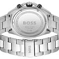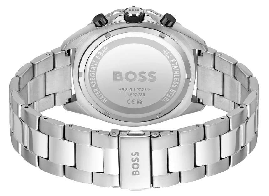Мужские часы Hugo Boss Energy HB1513971 представлены в круглом 44-мм корпусе из нержавеющей стали с частичным IP-покрытиемIP-покрытиеМетод ионного напыления. Демонстрирует повышенную устойчивость к истиранию, окислению и химическим веществам. Под воздействием высокого давления и температуры около 1500°C молекулы металла надёжно соединяются с частицами корпуса часов.. Оснащены кварцевым механизмом с функциями хронографаХронографФункция позволяет измерять отрезки времени с особой точностью: часы, минуты, секунды. Верным признаком хронографа является наличие на циферблате 3 дополнительных окошек-счётчиков., секундомеромСекундомерСекундоме́р — прибор, способный измерять интервалы времени с точностью до долей секунды. и тахиметромТахиметрРазмеченная шкала, располагается на ободке или безеле часов. Тахиметр позволяет рассчитать скорость на определённом участке пути, расстояние измеряется в километрах или милях. на безелеБезельВнешний ободок, закрепляющий стекло. В спортивных часах так называется поворотное кольцо с делениями на циферблате, выполняет роль таймера – замеряет отрезки времени на шкале. Неподвижный безель – элемент декора. Однонаправленно вращающийся безель на дайверских часах позволяет фиксировать моменты погружения и выныривания на поверхность.. Черный циферблат защищен устойчивым к царапинам минеральным стекломМинеральное стеклоМинеральное стекло представляет собой искусственно выращенный минерал кварца. Такое стекло отличается особой устойчивостью к повреждениям и царапинам. Уступает по некоторым качествам сапфировому стеклу.. Браслет из нержавеющей стали дополнен раскладной застёжкойРаскладная застёжкаТакой тип застёжки используется только на браслетах из металла. Она никогда не раскрывается полностью, происходит разделение на 2 и более частей. Раскладывающая застёжка снизит вероятность потери часов к минимуму., а стрелки покрыты люминесцентным составомЛюминесцентное покрытиеПозволяет считывать показания времени в темноте. Производители наносят на стрелки, часовые индексы, безель или поверхность циферблата светонакопительный состав, дающий холодное свечение. для видимости в темноте. Водонепроницаемость 50 метров (5 ATM) позволяет использовать часы для плавания.