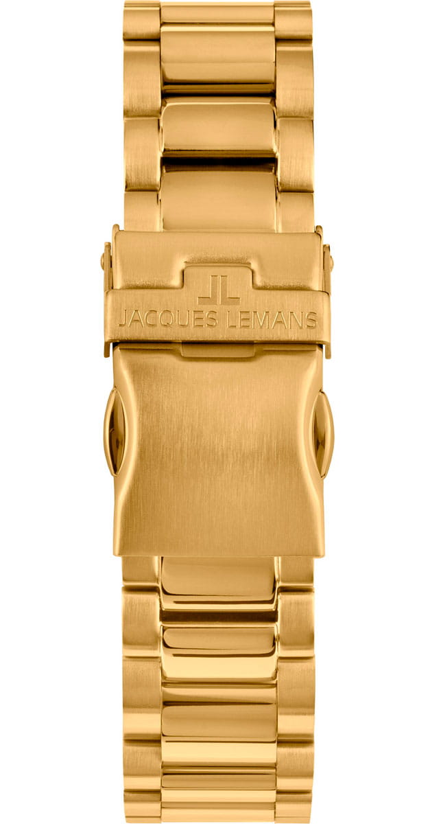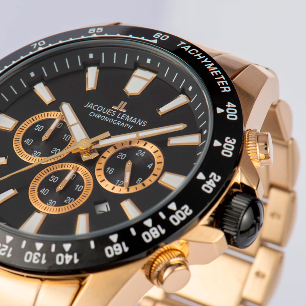 Кварцевый хронографХронографФункция позволяет измерять отрезки времени с особой точностью: часы, минуты, секунды. Верным признаком хронографа является наличие на циферблате 3 дополнительных окошек-счётчиков. в мощном корпусе диаметром 48 мм. Нержавеющая сталь с PVD-покрытиемPVDУльтратонкое покрытие наносится в технике вакуумного напыления, сочетает в себе нитрид титана особой прочности со слоем золота или оксида хрома. Несёт в себе декоративную или защитную функцию., из которой он сделан, отличается гипоаллергенными свойствами и стойкостью к коррозии. Широкий контрастный безельБезельВнешний ободок, закрепляющий стекло. В спортивных часах так называется поворотное кольцо с делениями на циферблате, выполняет роль таймера – замеряет отрезки времени на шкале. Неподвижный безель – элемент декора. Однонаправленно вращающийся безель на дайверских часах позволяет фиксировать моменты погружения и выныривания на поверхность. с тахиметрической шкалой обрамляет зеленый циферблат. На нем расположены три дополнительных индикатора и окошко даты. С помощью индикаторов можно засекать временные промежутки (секунды и минуты) и определять время в 24-часовом формате времяисчисления. В модели установлено минеральное стеклоМинеральное стеклоМинеральное стекло представляет собой искусственно выращенный минерал кварца. Такое стекло отличается особой устойчивостью к повреждениям и царапинам. Уступает по некоторым качествам сапфировому стеклу.. Повышенная водостойкость равна 10 атмосфер. Браслет из нержавеющей стали с PVD-покрытиемPVDУльтратонкое покрытие наносится в технике вакуумного напыления, сочетает в себе нитрид титана особой прочности со слоем золота или оксида хрома. Несёт в себе декоративную или защитную функцию. удерживает на запястье раскладная застёжкаРаскладная застёжкаТакой тип застёжки используется только на браслетах из металла. Она никогда не раскрывается полностью, происходит разделение на 2 и более частей. Раскладывающая застёжка снизит вероятность потери часов к минимуму.. Часы Jacques Lemans, надежные и функциональные, хорошо дополнят образ в спортивном или повседневном стиле.