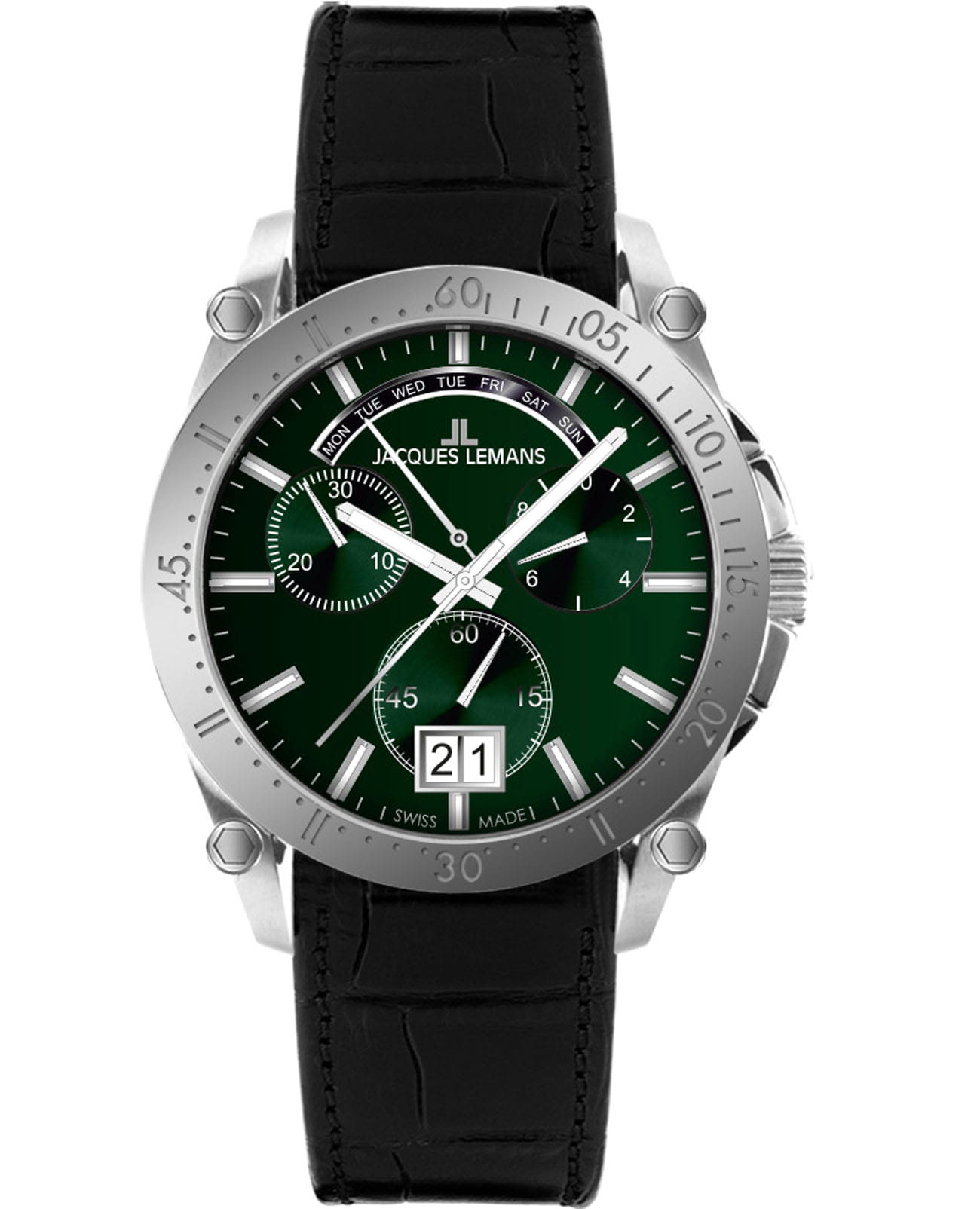 Мужские часы-хронографХронографФункция позволяет измерять отрезки времени с особой точностью: часы, минуты, секунды. Верным признаком хронографа является наличие на циферблате 3 дополнительных окошек-счётчиков. Jacques Lemans 1-2198B – лаконичная красота и изысканная элегантность. Оригинальная модель с классическим оформлением станет превосходным завершением образа, наделив его индивидуальным характером. Корпус выполнен из нержавеющей стали, диаметром 44 мм, что обеспечивает долговечность и утончённый внешний вид. Ударопрочное минеральное стеклоМинеральное стеклоМинеральное стекло представляет собой искусственно выращенный минерал кварца. Такое стекло отличается особой устойчивостью к повреждениям и царапинам. Уступает по некоторым качествам сапфировому стеклу. Crystex защищает циферблат от царапин. Кожаный ремешок на стандартной застёжке обеспечивает комфортное ношение. Водозащита 100 метров позволит плавать, нырять и заниматься другими водными видами спорта. Стрелки и метки с люминесцентным покрытиемЛюминесцентное покрытиеПозволяет считывать показания времени в темноте. Производители наносят на стрелки, часовые индексы, безель или поверхность циферблата светонакопительный состав, дающий холодное свечение. позволяющие легко определять время даже в темноте. Окошко даты находится в положении 6 часов. Широкое окошко дня недели в положении 12 часов позволяет показывать название дня недели. Это аксессуар для мужчины, который ценит классический стиль и функциональность.