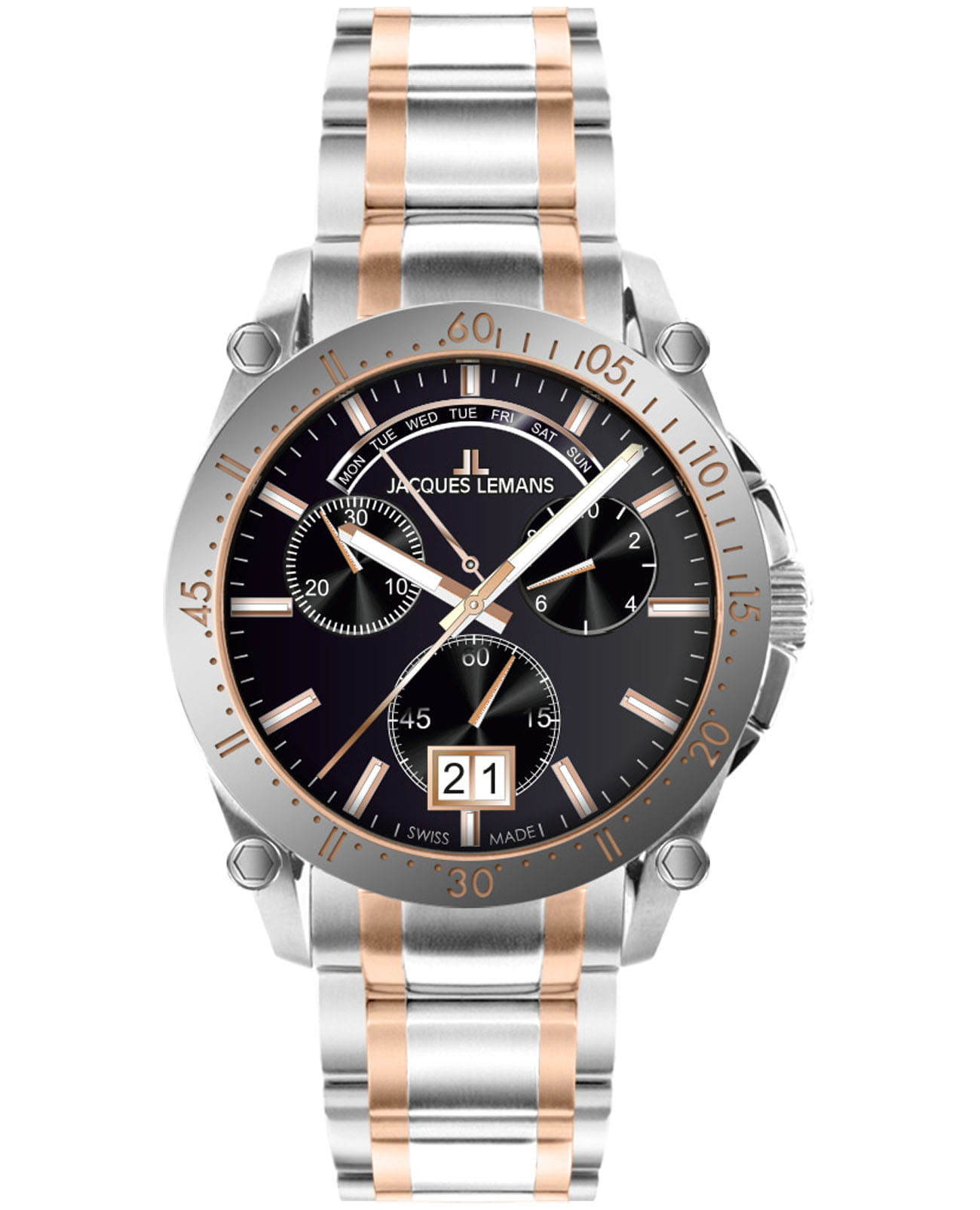 Мужские часы-хронографХронографФункция позволяет измерять отрезки времени с особой точностью: часы, минуты, секунды. Верным признаком хронографа является наличие на циферблате 3 дополнительных окошек-счётчиков. Jacques Lemans 1-2198G – лаконичная красота и изысканная элегантность. Оригинальная модель с классическим оформлением станет превосходным завершением образа, наделив его индивидуальным характером. Корпус выполнен из нержавеющей стали, диаметром 44 мм, что обеспечивает долговечность и утончённый внешний вид. Ударопрочное минеральное стеклоМинеральное стеклоМинеральное стекло представляет собой искусственно выращенный минерал кварца. Такое стекло отличается особой устойчивостью к повреждениям и царапинам. Уступает по некоторым качествам сапфировому стеклу. с сапфировым напылением защищает циферблат от царапин. Стальной браслет с частичным IP-покрытиемIP-покрытиеМетод ионного напыления. Демонстрирует повышенную устойчивость к истиранию, окислению и химическим веществам. Под воздействием высокого давления и температуры около 1500°C молекулы металла надёжно соединяются с частицами корпуса часов. на раскладной застёжкеРаскладная застёжкаТакой тип застёжки используется только на браслетах из металла. Она никогда не раскрывается полностью, происходит разделение на 2 и более частей. Раскладывающая застёжка снизит вероятность потери часов к минимуму. обеспечивает комфортное ношение. Водозащита 100 метров позволит плавать, нырять и заниматься другими водными видами спорта. Стрелки и метки с люминесцентным покрытиемЛюминесцентное покрытиеПозволяет считывать показания времени в темноте. Производители наносят на стрелки, часовые индексы, безель или поверхность циферблата светонакопительный состав, дающий холодное свечение. позволяющие легко определять время даже в темноте. Окошко даты находится в положении 6 часов. Широкое окошко дня недели в положении 12 часов позволяет показывать название дня недели. Это аксессуар для мужчины, который ценит классический стиль и функциональность.