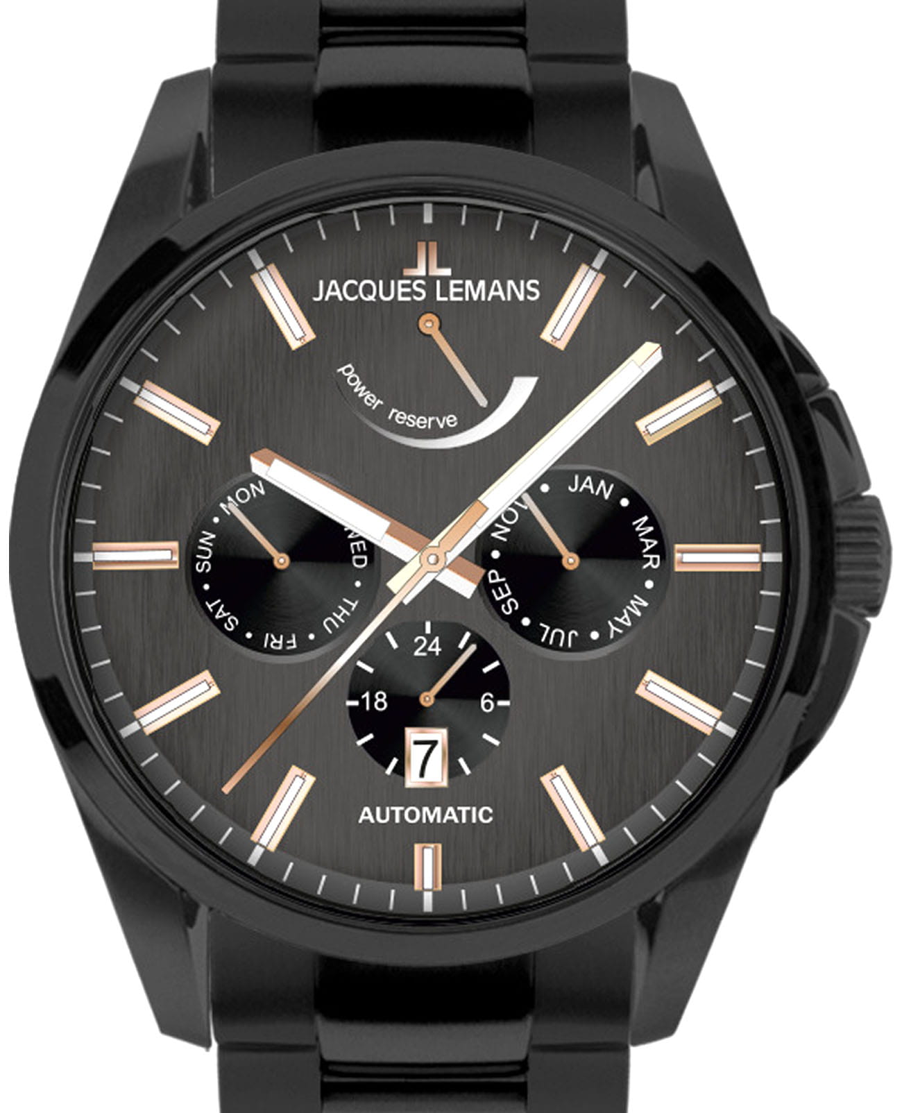 Мужские механические часы с автоподзаводом Jacques Lemans 1-2204C – лаконичная красота и изысканная элегантность. Оригинальная модель с классическим оформлением станет превосходным завершением образа, наделив его индивидуальным характером. Корпус выполнен из нержавеющей стали с PVD-покрытиемPVDУльтратонкое покрытие наносится в технике вакуумного напыления, сочетает в себе нитрид титана особой прочности со слоем золота или оксида хрома. Несёт в себе декоративную или защитную функцию. черного цвета, диаметром 44 мм, что обеспечивает долговечность и утончённый внешний вид. Минеральное стеклоМинеральное стеклоМинеральное стекло представляет собой искусственно выращенный минерал кварца. Такое стекло отличается особой устойчивостью к повреждениям и царапинам. Уступает по некоторым качествам сапфировому стеклу. с сапфировым напылением защищает циферблат от царапин. Стальной браслет на раскладной застёжкеРаскладная застёжкаТакой тип застёжки используется только на браслетах из металла. Она никогда не раскрывается полностью, происходит разделение на 2 и более частей. Раскладывающая застёжка снизит вероятность потери часов к минимуму. обеспечивает комфортное ношение. Водозащита 100 метров позволит плавать, нырять и заниматься другими водными видами спорта. Стрелки и метки с люминесцентным покрытиемЛюминесцентное покрытиеПозволяет считывать показания времени в темноте. Производители наносят на стрелки, часовые индексы, безель или поверхность циферблата светонакопительный состав, дающий холодное свечение. позволяющие легко определять время даже в темноте. Окошко даты находится в положении 6 часов. Индикатор 24-х часов, календарь недели и месяцев вынесены на отдельные циферблаты. Индикация запаса хода в положении 12 часов. Рифленая заводная головка с защитой. Это аксессуар для мужчины, который ценит классический стиль и функциональность.