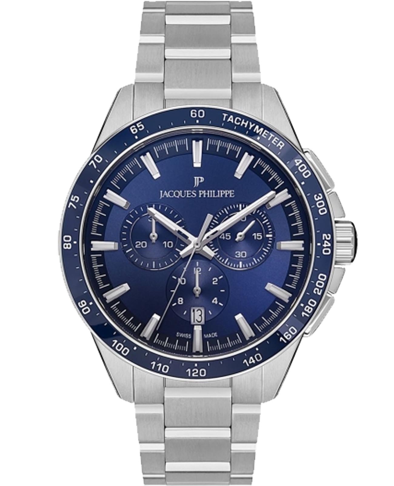 Швейцарские мужские часы-хронографХронографФункция позволяет измерять отрезки времени с особой точностью: часы, минуты, секунды. Верным признаком хронографа является наличие на циферблате 3 дополнительных окошек-счётчиков. с секундомеромСекундомерСекундоме́р — прибор, способный измерять интервалы времени с точностью до долей секунды. Jacques Philippe Magnificus JPQGC251336, кварцевый механизм с высокой точностью. Сапфировое стеклоСапфировое стеклоПрочный и надёжный материал из кристалла сапфира синтетического происхождения, характеризующийся особой твёрдостью и устойчивостью к царапинам и повреждениям. устойчивое к появлению царапин, обладающее высокой прозрачностью. Корпус часов изготовлен из нержавеющей стали. БезельБезельВнешний ободок, закрепляющий стекло. В спортивных часах так называется поворотное кольцо с делениями на циферблате, выполняет роль таймера – замеряет отрезки времени на шкале. Неподвижный безель – элемент декора. Однонаправленно вращающийся безель на дайверских часах позволяет фиксировать моменты погружения и выныривания на поверхность. с IP-покрытиемIP-покрытиеМетод ионного напыления. Демонстрирует повышенную устойчивость к истиранию, окислению и химическим веществам. Под воздействием высокого давления и температуры около 1500°C молекулы металла надёжно соединяются с частицами корпуса часов. с тахиметромТахиметрРазмеченная шкала, располагается на ободке или безеле часов. Тахиметр позволяет рассчитать скорость на определённом участке пути, расстояние измеряется в километрах или милях.. На циферблате три дополнительных индикатора. Окошко даты находится в положении 6 часов. Стрелки с люминесцентным покрытиемЛюминесцентное покрытиеПозволяет считывать показания времени в темноте. Производители наносят на стрелки, часовые индексы, безель или поверхность циферблата светонакопительный состав, дающий холодное свечение.. Класс водозащиты: 100 метров, позволит плавать, нырять и заниматься другими водными видами спорта. Стальной браслет на застёжке-бабочке.
