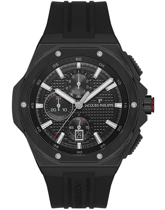 Швейцарские мужские часы-хронографХронографФункция позволяет измерять отрезки времени с особой точностью: часы, минуты, секунды. Верным признаком хронографа является наличие на циферблате 3 дополнительных окошек-счётчиков. с секундомеромСекундомерСекундоме́р — прибор, способный измерять интервалы времени с точностью до долей секунды. Jacques Philippe Esquire JPQGC484411, кварцевый механизм с высокой точностью. Сапфировое стеклоСапфировое стеклоПрочный и надёжный материал из кристалла сапфира синтетического происхождения, характеризующийся особой твёрдостью и устойчивостью к царапинам и повреждениям. устойчивое к появлению царапин, обладающее высокой прозрачностью. Корпус часов изготовлен из нержавеющей стали с IP-покрытиемIP-покрытиеМетод ионного напыления. Демонстрирует повышенную устойчивость к истиранию, окислению и химическим веществам. Под воздействием высокого давления и температуры около 1500°C молекулы металла надёжно соединяются с частицами корпуса часов.. На циферблате три дополнительных индикатора. Стрелки и метки с люминесцентным покрытиемЛюминесцентное покрытиеПозволяет считывать показания времени в темноте. Производители наносят на стрелки, часовые индексы, безель или поверхность циферблата светонакопительный состав, дающий холодное свечение.. Шкала тахиметраТахиметрРазмеченная шкала, располагается на ободке или безеле часов. Тахиметр позволяет рассчитать скорость на определённом участке пути, расстояние измеряется в километрах или милях. на циферблате. Класс водозащиты: 50 метров, позволит защитить корпус от случайных брызг или капель дождя. Силиконовый ремешок.