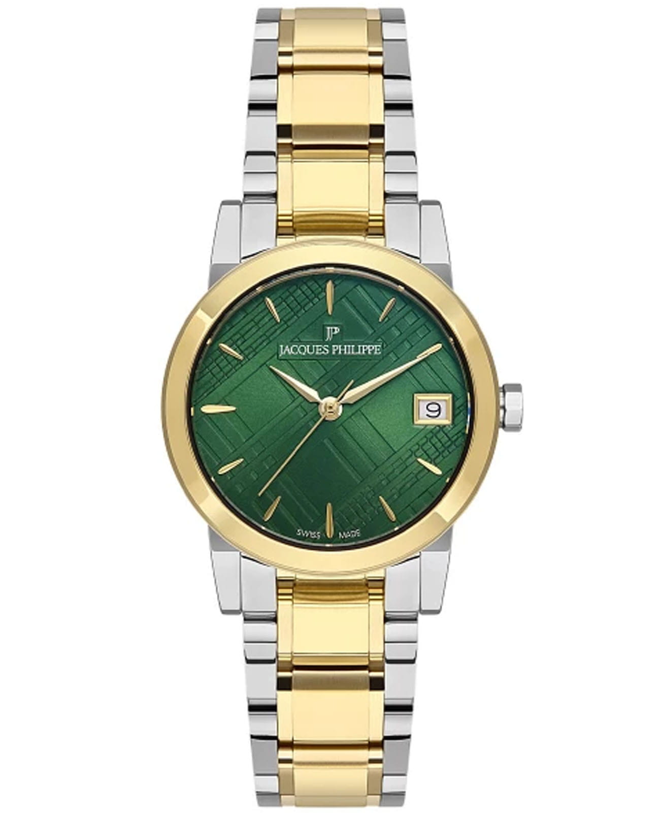 Швейцарские женские часы Jacques Philippe Cosmos JPQLS3173X8, кварцевый механизм с высокой точностью. Сапфировое стеклоСапфировое стеклоПрочный и надёжный материал из кристалла сапфира синтетического происхождения, характеризующийся особой твёрдостью и устойчивостью к царапинам и повреждениям. устойчивое к появлению царапин, обладающее высокой прозрачностью. Корпус часов изготовлен из нержавеющей стали. Окошко даты находится в положении 3 часа. Класс водозащиты: 50 метров, позволит защитить корпус от случайных брызг или капель дождя. Стальной браслет с частичным IP-покрытиемIP-покрытиеМетод ионного напыления. Демонстрирует повышенную устойчивость к истиранию, окислению и химическим веществам. Под воздействием высокого давления и температуры около 1500°C молекулы металла надёжно соединяются с частицами корпуса часов. на застёжке «бабочка» с кнопкамиЗастёжка "бабочка"Такой вид застёжки дополняется предохранителями, помогающими избежать случайного раскрытия браслета. Обладают изящным исполнением. . БезельБезельВнешний ободок, закрепляющий стекло. В спортивных часах так называется поворотное кольцо с делениями на циферблате, выполняет роль таймера – замеряет отрезки времени на шкале. Неподвижный безель – элемент декора. Однонаправленно вращающийся безель на дайверских часах позволяет фиксировать моменты погружения и выныривания на поверхность. с IP-покрытиемIP-покрытиеМетод ионного напыления. Демонстрирует повышенную устойчивость к истиранию, окислению и химическим веществам. Под воздействием высокого давления и температуры около 1500°C молекулы металла надёжно соединяются с частицами корпуса часов..
