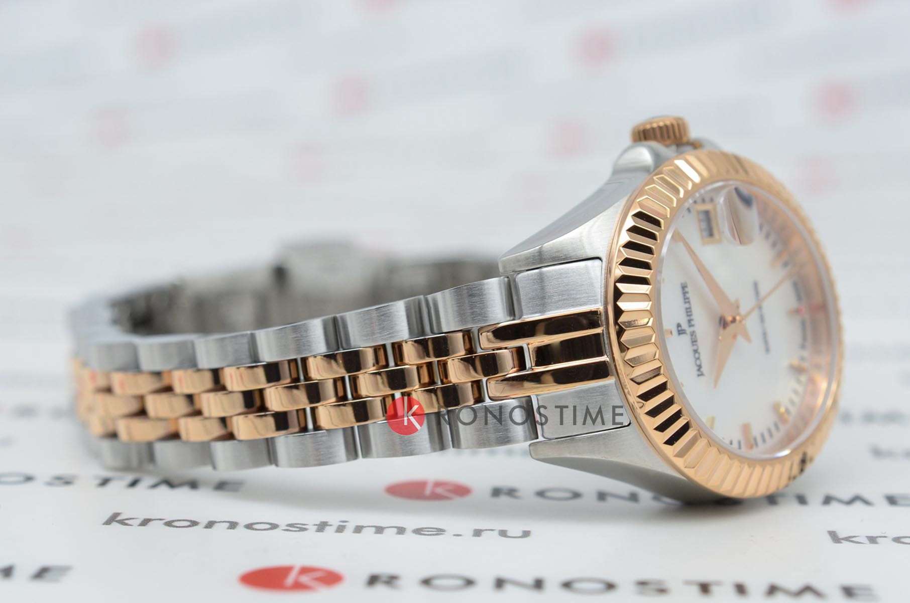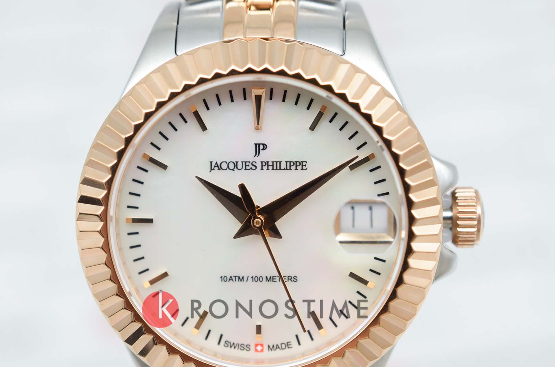 Jacques Philippe JPQLS827388RG — женские часы в сдержанном классическом исполнении с акцентом на простоту и надёжность. Корпус диаметром 26 мм выполнен из нержавеющей стали — делает модель универсальной и комфортной в повседневной носке. Циферблат оформлен в светлом металлическом тоне с тонкими стрелками, лаконичными часовыми метками и аккуратным окошком даты в позиции «3 часа». Минималистичный стиль подчёркивает строгость и чистоту дизайна. Поверхность защищена устойчивым к царапинам сапфировым стекломСапфировое стеклоПрочный и надёжный материал из кристалла сапфира синтетического происхождения, характеризующийся особой твёрдостью и устойчивостью к царапинам и повреждениям., которое обеспечивает хорошую читаемость и долговечность. БезельБезельВнешний ободок, закрепляющий стекло. В спортивных часах так называется поворотное кольцо с делениями на циферблате, выполняет роль таймера – замеряет отрезки времени на шкале. Неподвижный безель – элемент декора. Однонаправленно вращающийся безель на дайверских часах позволяет фиксировать моменты погружения и выныривания на поверхность. с PVD-покрытиемPVDУльтратонкое покрытие наносится в технике вакуумного напыления, сочетает в себе нитрид титана особой прочности со слоем золота или оксида хрома. Несёт в себе декоративную или защитную функцию.. Механизм — точный швейцарский кварц, не требующий подзавода. Он обеспечивает стабильную и бесперебойную работу часов, сохраняя точность в любых условиях. Браслет из нержавеющей стали с PVD-покрытиемPVDУльтратонкое покрытие наносится в технике вакуумного напыления, сочетает в себе нитрид титана особой прочности со слоем золота или оксида хрома. Несёт в себе декоративную или защитную функцию. визуально продолжает корпус и фиксируется на застёжке-бабочке с кнопкамиЗастёжка "бабочка"Такой вид застёжки дополняется предохранителями, помогающими избежать случайного раскрытия браслета. Обладают изящным исполнением. , обеспечивая комфортную посадку. Водозащита до 10 ATM позволяет использовать часы не только в повседневной жизни, но и при активности на воде. Jacques Philippe — это надёжная и универсальная модель для тех, кто ценит швейцарскую точность, простоту и уверенный стиль без лишних деталей.