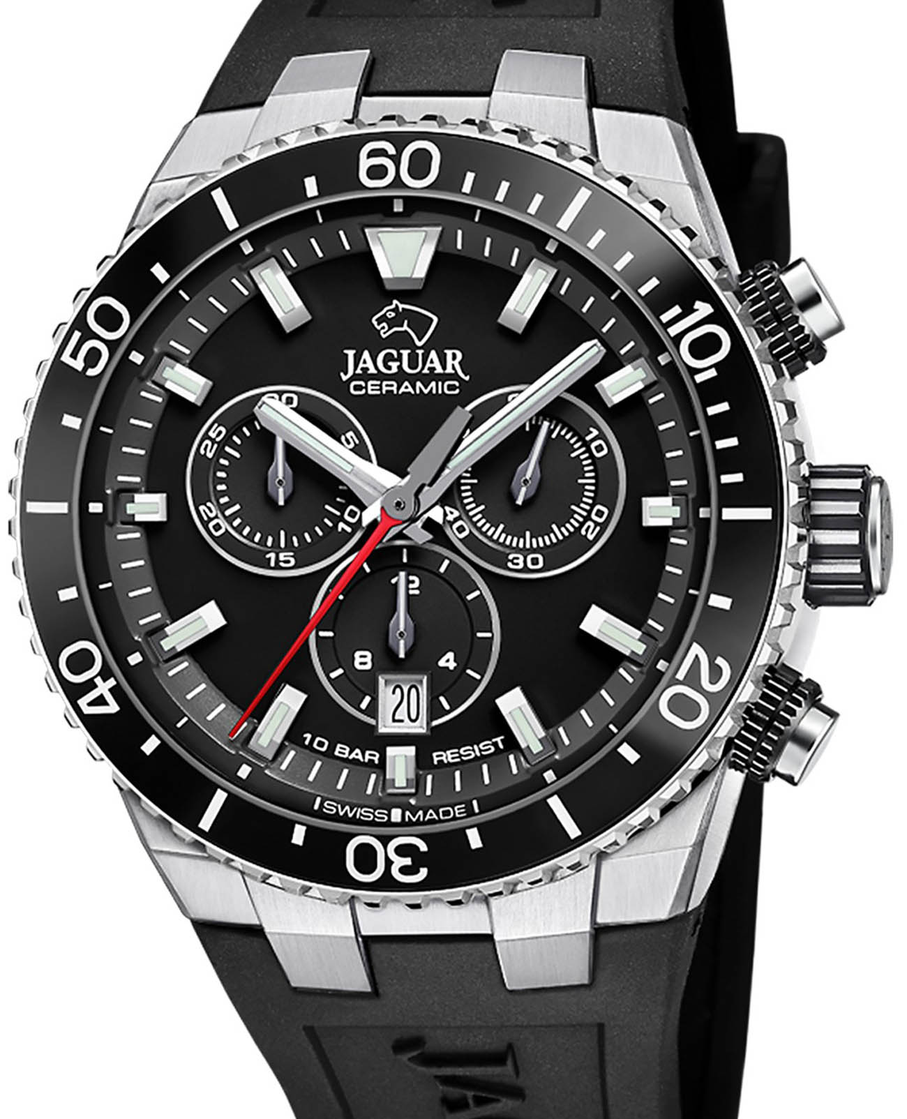 Мужские швейцарские часы-хронографХронографФункция позволяет измерять отрезки времени с особой точностью: часы, минуты, секунды. Верным признаком хронографа является наличие на циферблате 3 дополнительных окошек-счётчиков. Jaguar Ceramic J1021/5. Кварцевый швейцарский калибр Ronda 5030d. Сапфировое стеклоСапфировое стеклоПрочный и надёжный материал из кристалла сапфира синтетического происхождения, характеризующийся особой твёрдостью и устойчивостью к царапинам и повреждениям. устойчивое к мелким механическим повреждениям. Корпус часов изготовлен из нержавеющей стали. Стрелки и метки с люминесцентным покрытиемЛюминесцентное покрытиеПозволяет считывать показания времени в темноте. Производители наносят на стрелки, часовые индексы, безель или поверхность циферблата светонакопительный состав, дающий холодное свечение.. Окошко даты находится в положении 6 часов. Класс водозащиты: 100 метров, позволит плавать, нырять и заниматься другими водными видами спорта. Силиконовый ремешок на стандартной застёжке. БезельБезельВнешний ободок, закрепляющий стекло. В спортивных часах так называется поворотное кольцо с делениями на циферблате, выполняет роль таймера – замеряет отрезки времени на шкале. Неподвижный безель – элемент декора. Однонаправленно вращающийся безель на дайверских часах позволяет фиксировать моменты погружения и выныривания на поверхность. из высокотехнологичной керамикиВысокотехнологичная керамикаИнновационный запатентованный Rado материал с гладкой или матовой поверхностью. Керамика за счёт кристаллической структуры обладает повышенной устойчивостью от возникновения царапин. Материал способен принимать температуру тела человека, обеспечивая невероятный комфорт при ношении..