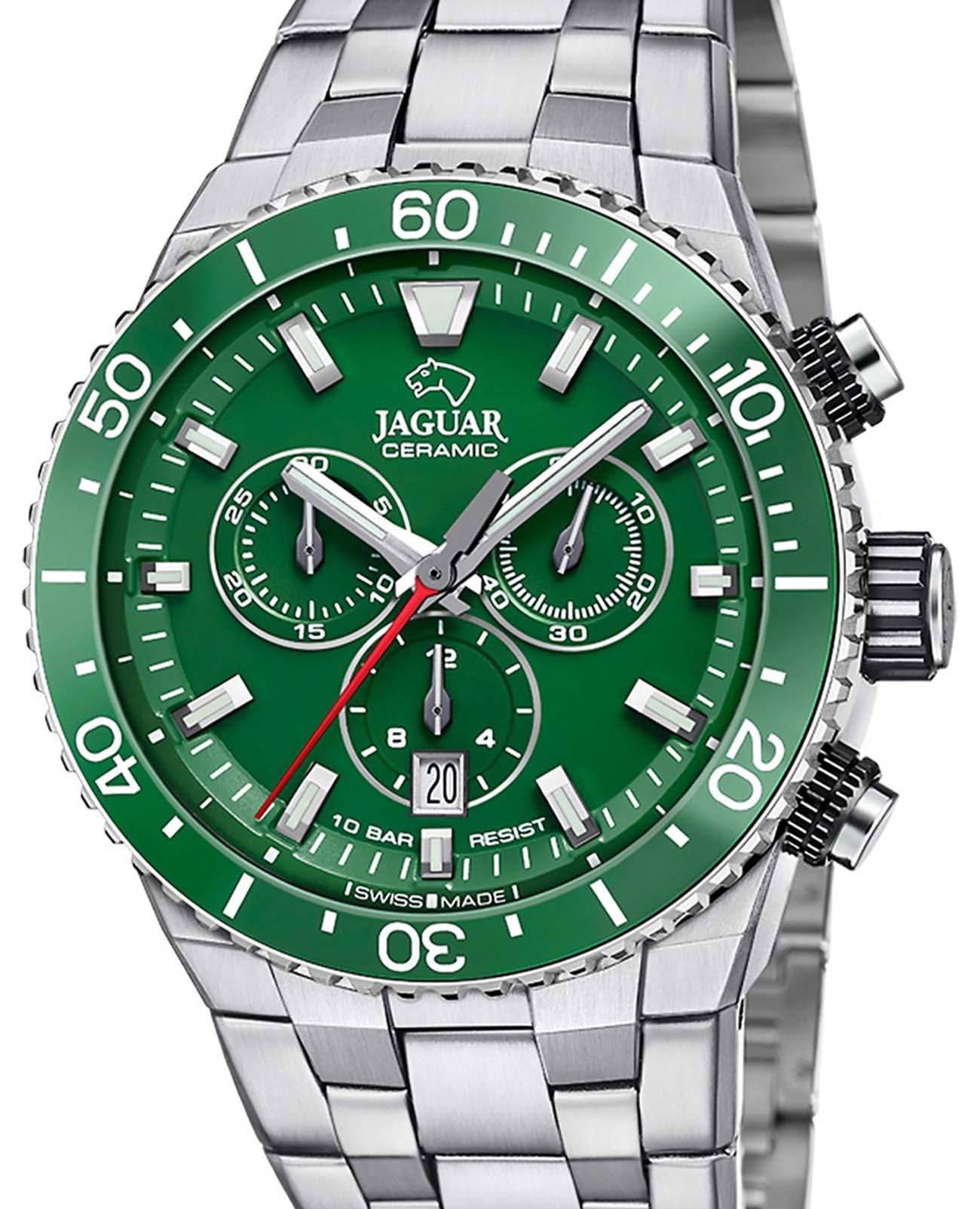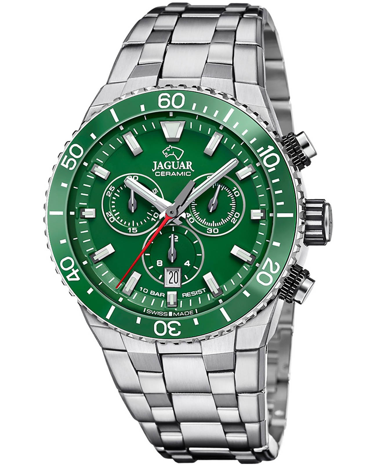 Мужские швейцарские часы-хронографХронографФункция позволяет измерять отрезки времени с особой точностью: часы, минуты, секунды. Верным признаком хронографа является наличие на циферблате 3 дополнительных окошек-счётчиков. Jaguar Ceramic J1022/3. Кварцевый швейцарский калибр Ronda 5030d. Сапфировое стеклоСапфировое стеклоПрочный и надёжный материал из кристалла сапфира синтетического происхождения, характеризующийся особой твёрдостью и устойчивостью к царапинам и повреждениям. устойчивое к мелким механическим повреждениям. Корпус часов изготовлен из нержавеющей стали. Стрелки и метки с люминесцентным покрытиемЛюминесцентное покрытиеПозволяет считывать показания времени в темноте. Производители наносят на стрелки, часовые индексы, безель или поверхность циферблата светонакопительный состав, дающий холодное свечение.. Окошко даты находится в положении 6 часов. Класс водозащиты: 100 метров, позволит плавать, нырять и заниматься другими водными видами спорта. БезельБезельВнешний ободок, закрепляющий стекло. В спортивных часах так называется поворотное кольцо с делениями на циферблате, выполняет роль таймера – замеряет отрезки времени на шкале. Неподвижный безель – элемент декора. Однонаправленно вращающийся безель на дайверских часах позволяет фиксировать моменты погружения и выныривания на поверхность. из высокотехнологичной керамикиВысокотехнологичная керамикаИнновационный запатентованный Rado материал с гладкой или матовой поверхностью. Керамика за счёт кристаллической структуры обладает повышенной устойчивостью от возникновения царапин. Материал способен принимать температуру тела человека, обеспечивая невероятный комфорт при ношении.. Стальной браслет на раскладной застёжкеРаскладная застёжкаТакой тип застёжки используется только на браслетах из металла. Она никогда не раскрывается полностью, происходит разделение на 2 и более частей. Раскладывающая застёжка снизит вероятность потери часов к минимуму..