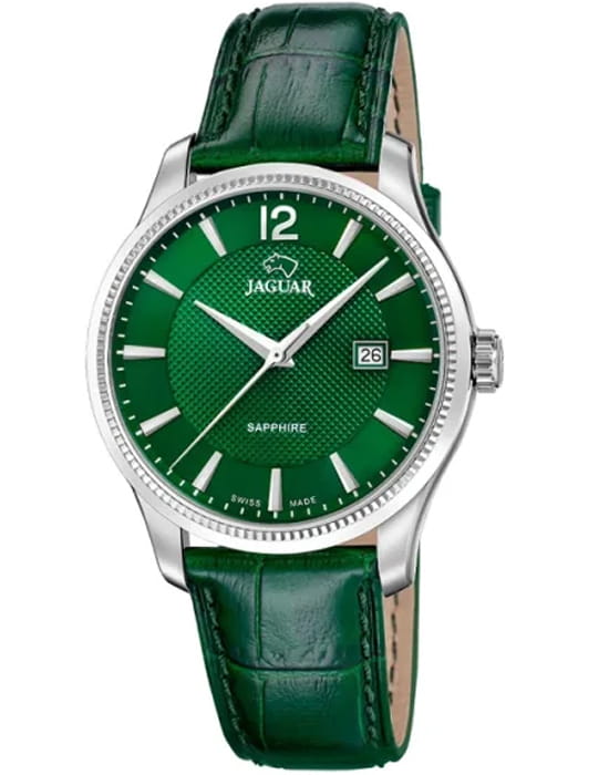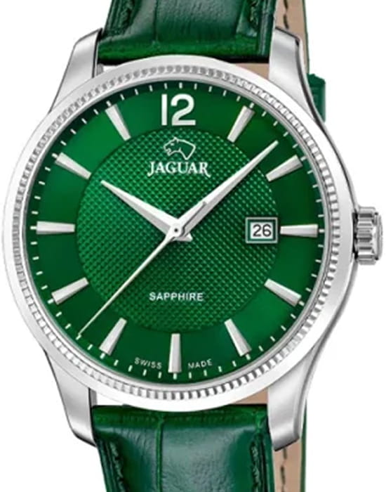 Jaguar J1042/4 из коллекции Acamar — элегантные мужские часы, сочетающие швейцарское качество и современный дизайн. Корпус диаметром 40 мм выполнен из нержавеющей стали, что обеспечивает прочность и долговечность. Сапфировое стеклоСапфировое стеклоПрочный и надёжный материал из кристалла сапфира синтетического происхождения, характеризующийся особой твёрдостью и устойчивостью к царапинам и повреждениям. защищает циферблат от царапин и повреждений. Зеленый циферблат с серебристыми стрелками подчёркивает изысканный стиль. Часы оснащены функцией индикации даты, расположенной в окошке на отметке «3 часа», что добавляет практичности. Ремешок из кожи гарантирует комфортное ношение. Классическая застёжка обеспечивает надёжную фиксацию на запястье. Водозащита до 5 ATM (50 метров) делает часы подходящими для повседневного использования. Jaguar J1042/4 — это идеальный выбор для мужчин, которые ценят классический дизайн и современные технологии.