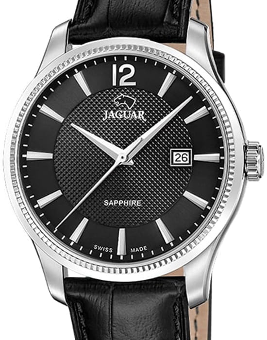 Jaguar J1042/5 из коллекции Acamar — элегантные мужские часы, сочетающие швейцарское качество и современный дизайн. Корпус диаметром 40 мм выполнен из нержавеющей стали, что обеспечивает прочность и долговечность. Сапфировое стеклоСапфировое стеклоПрочный и надёжный материал из кристалла сапфира синтетического происхождения, характеризующийся особой твёрдостью и устойчивостью к царапинам и повреждениям. защищает циферблат от царапин и повреждений. Черный циферблат с серебристыми стрелками подчёркивает изысканный стиль. Часы оснащены функцией индикации даты, расположенной в окошке на отметке «3 часа», что добавляет практичности. Ремешок из кожи гарантирует комфортное ношение. Классическая застёжка обеспечивает надёжную фиксацию на запястье. Водозащита до 5 ATM (50 метров) делает часы подходящими для повседневного использования. Jaguar J1042/5 — это идеальный выбор для мужчин, которые ценят классический дизайн и современные технологии.