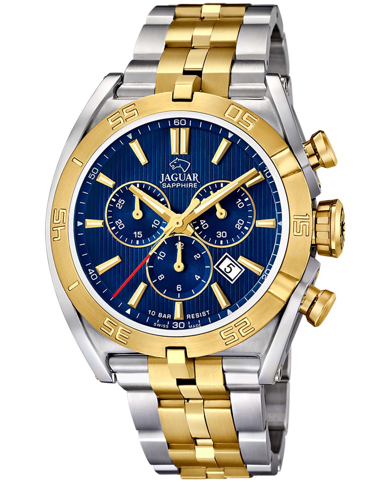 Мужские швейцарские часы-хронографХронографФункция позволяет измерять отрезки времени с особой точностью: часы, минуты, секунды. Верным признаком хронографа является наличие на циферблате 3 дополнительных окошек-счётчиков. Jaguar Executive J855/A. Кварцевый швейцарский калибр Ronda 5030d. Сапфировое стеклоСапфировое стеклоПрочный и надёжный материал из кристалла сапфира синтетического происхождения, характеризующийся особой твёрдостью и устойчивостью к царапинам и повреждениям. устойчивое к мелким механическим повреждениям. Корпус и браслет часов изготовлены из нержавеющей стали. Стрелки и метки с люминесцентным покрытиемЛюминесцентное покрытиеПозволяет считывать показания времени в темноте. Производители наносят на стрелки, часовые индексы, безель или поверхность циферблата светонакопительный состав, дающий холодное свечение.. Окошко даты находится в положении между «4» и «5 часами». Класс водозащиты: 100 метров, позволит плавать, нырять и заниматься другими водными видами спорта. Стальной браслет с частичным  PVD-покрытиемPVDУльтратонкое покрытие наносится в технике вакуумного напыления, сочетает в себе нитрид титана особой прочности со слоем золота или оксида хрома. Несёт в себе декоративную или защитную функцию. на раскладной застёжкеРаскладная застёжкаТакой тип застёжки используется только на браслетах из металла. Она никогда не раскрывается полностью, происходит разделение на 2 и более частей. Раскладывающая застёжка снизит вероятность потери часов к минимуму.. БезельБезельВнешний ободок, закрепляющий стекло. В спортивных часах так называется поворотное кольцо с делениями на циферблате, выполняет роль таймера – замеряет отрезки времени на шкале. Неподвижный безель – элемент декора. Однонаправленно вращающийся безель на дайверских часах позволяет фиксировать моменты погружения и выныривания на поверхность. с PVD-покрытиемPVDУльтратонкое покрытие наносится в технике вакуумного напыления, сочетает в себе нитрид титана особой прочности со слоем золота или оксида хрома. Несёт в себе декоративную или защитную функцию..