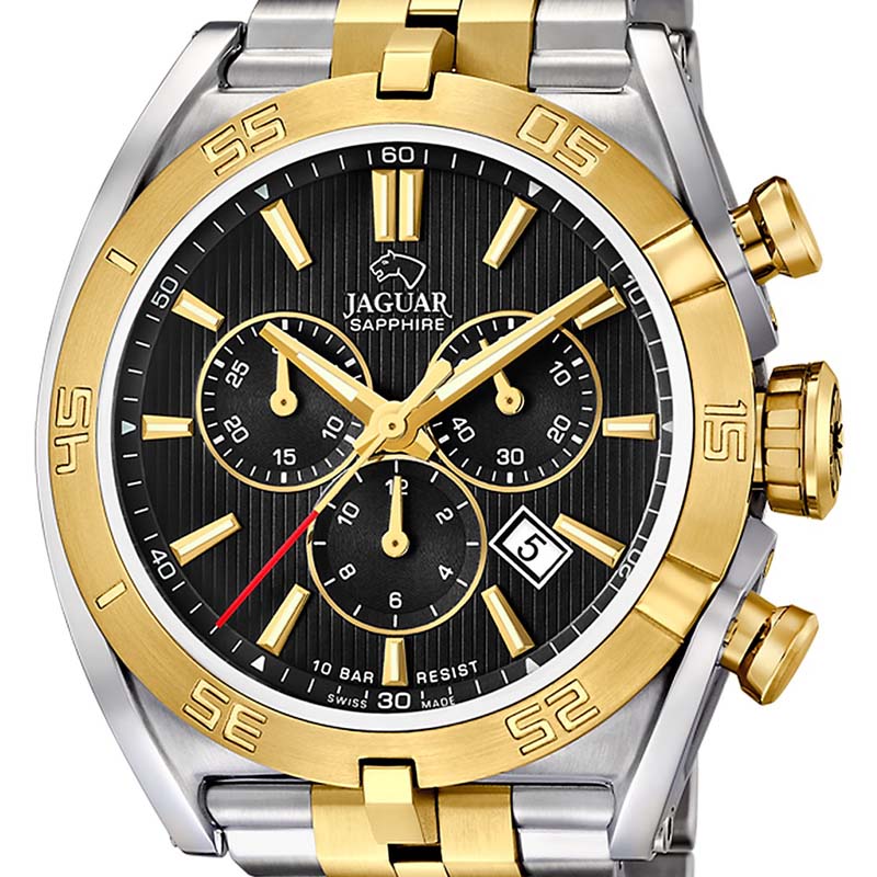 Мужские швейцарские часы-хронографХронографФункция позволяет измерять отрезки времени с особой точностью: часы, минуты, секунды. Верным признаком хронографа является наличие на циферблате 3 дополнительных окошек-счётчиков. Jaguar Executive J855/C. Кварцевый швейцарский калибр Ronda 5030d. Сапфировое стеклоСапфировое стеклоПрочный и надёжный материал из кристалла сапфира синтетического происхождения, характеризующийся особой твёрдостью и устойчивостью к царапинам и повреждениям. устойчивое к мелким механическим повреждениям. Корпус и браслет часов изготовлены из нержавеющей стали. Стрелки и метки с люминесцентным покрытиемЛюминесцентное покрытиеПозволяет считывать показания времени в темноте. Производители наносят на стрелки, часовые индексы, безель или поверхность циферблата светонакопительный состав, дающий холодное свечение.. Окошко даты находится в положении между «4» и «5 часами». Класс водозащиты: 100 метров, позволит плавать, нырять и заниматься другими водными видами спорта. Стальной браслет с частичным PVD-покрытиемPVDУльтратонкое покрытие наносится в технике вакуумного напыления, сочетает в себе нитрид титана особой прочности со слоем золота или оксида хрома. Несёт в себе декоративную или защитную функцию. на раскладной застёжкеРаскладная застёжкаТакой тип застёжки используется только на браслетах из металла. Она никогда не раскрывается полностью, происходит разделение на 2 и более частей. Раскладывающая застёжка снизит вероятность потери часов к минимуму.. БезельБезельВнешний ободок, закрепляющий стекло. В спортивных часах так называется поворотное кольцо с делениями на циферблате, выполняет роль таймера – замеряет отрезки времени на шкале. Неподвижный безель – элемент декора. Однонаправленно вращающийся безель на дайверских часах позволяет фиксировать моменты погружения и выныривания на поверхность. с PVD-покрытиемPVDУльтратонкое покрытие наносится в технике вакуумного напыления, сочетает в себе нитрид титана особой прочности со слоем золота или оксида хрома. Несёт в себе декоративную или защитную функцию..