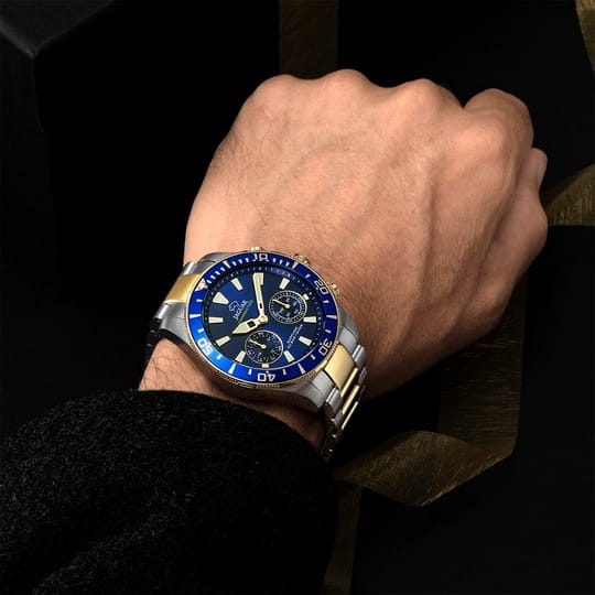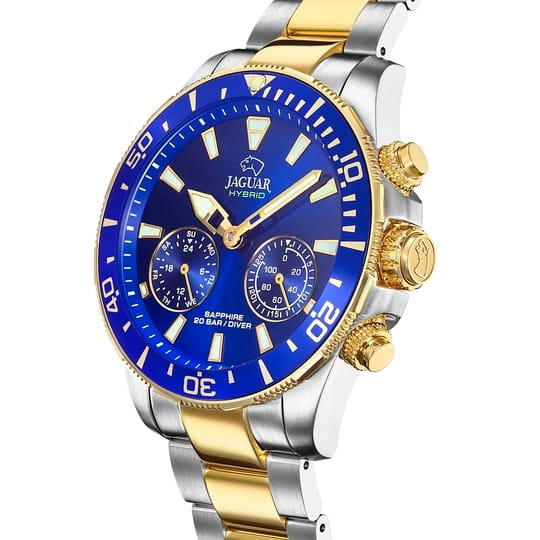 Мужские швейцарские часы Jaguar Connected J889/1. Сапфировое стеклоСапфировое стеклоПрочный и надёжный материал из кристалла сапфира синтетического происхождения, характеризующийся особой твёрдостью и устойчивостью к царапинам и повреждениям. устойчивое к мелким механическим повреждениям. Корпус часов изготовлен из нержавеющей стали. Стрелки и метки с люминесцентным покрытиемЛюминесцентное покрытиеПозволяет считывать показания времени в темноте. Производители наносят на стрелки, часовые индексы, безель или поверхность циферблата светонакопительный состав, дающий холодное свечение.. Календарь находится в положении 8 часов. Класс водозащиты: 200 метров, позволит плавать, нырять и заниматься другими водными видами спорта. Стальной браслет с частичным PVD-покрытиемPVDУльтратонкое покрытие наносится в технике вакуумного напыления, сочетает в себе нитрид титана особой прочности со слоем золота или оксида хрома. Несёт в себе декоративную или защитную функцию. на раскладной застёжкеРаскладная застёжкаТакой тип застёжки используется только на браслетах из металла. Она никогда не раскрывается полностью, происходит разделение на 2 и более частей. Раскладывающая застёжка снизит вероятность потери часов к минимуму.. БезельБезельВнешний ободок, закрепляющий стекло. В спортивных часах так называется поворотное кольцо с делениями на циферблате, выполняет роль таймера – замеряет отрезки времени на шкале. Неподвижный безель – элемент декора. Однонаправленно вращающийся безель на дайверских часах позволяет фиксировать моменты погружения и выныривания на поверхность. с PVD-покрытиемPVDУльтратонкое покрытие наносится в технике вакуумного напыления, сочетает в себе нитрид титана особой прочности со слоем золота или оксида хрома. Несёт в себе декоративную или защитную функцию.. За точный ход работы часов, из коллекции Connected, отвечает кварцевый гибридный механизм швейцарского производства со Смарт-Модулем. Данный тип механизма обеспечивает возможность подключить часы к телефону через Bluetooth и управлять большим рядом дополнительных функций на выбор с помошью приложения Jaguar. Дополнительные функции: отображение даты и дня недели, секундомер, таймер, GMT, шагомер, поиск телефона, включение/выключение звука телефона при входящих вызовах, переключение музыки, вибро-уведомления.