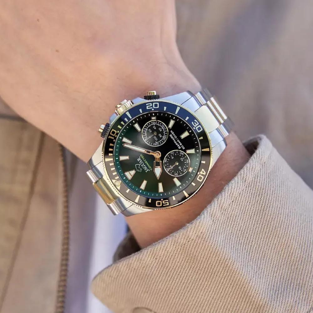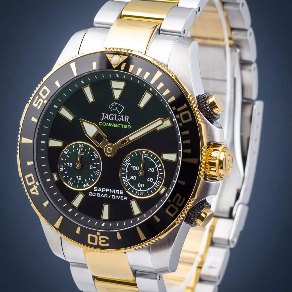 Мужские швейцарские часы Jaguar Connected J889/5. Сапфировое стеклоСапфировое стеклоПрочный и надёжный материал из кристалла сапфира синтетического происхождения, характеризующийся особой твёрдостью и устойчивостью к царапинам и повреждениям. устойчивое к мелким механическим повреждениям. Корпус часов изготовлен из нержавеющей стали. Стрелки и метки с люминесцентным покрытиемЛюминесцентное покрытиеПозволяет считывать показания времени в темноте. Производители наносят на стрелки, часовые индексы, безель или поверхность циферблата светонакопительный состав, дающий холодное свечение.. Календарь находится в положении 8 часов. Класс водозащиты: 200 метров, позволит плавать, нырять и заниматься другими водными видами спорта. Стальной браслет с частичным PVD-покрытиемPVDУльтратонкое покрытие наносится в технике вакуумного напыления, сочетает в себе нитрид титана особой прочности со слоем золота или оксида хрома. Несёт в себе декоративную или защитную функцию. на раскладной застёжкеРаскладная застёжкаТакой тип застёжки используется только на браслетах из металла. Она никогда не раскрывается полностью, происходит разделение на 2 и более частей. Раскладывающая застёжка снизит вероятность потери часов к минимуму.. БезельБезельВнешний ободок, закрепляющий стекло. В спортивных часах так называется поворотное кольцо с делениями на циферблате, выполняет роль таймера – замеряет отрезки времени на шкале. Неподвижный безель – элемент декора. Однонаправленно вращающийся безель на дайверских часах позволяет фиксировать моменты погружения и выныривания на поверхность. с PVD-покрытиемPVDУльтратонкое покрытие наносится в технике вакуумного напыления, сочетает в себе нитрид титана особой прочности со слоем золота или оксида хрома. Несёт в себе декоративную или защитную функцию.. За точный ход работы часов, из коллекции Connected, отвечает кварцевый гибридный механизм швейцарского производства со Смарт-Модулем. Данный тип механизма обеспечивает возможность подключить часы к телефону через Bluetooth и управлять большим рядом дополнительных функций на выбор с помошью приложения Jaguar. Дополнительные функции: отображение даты и дня недели, секундомер, таймер, GMT, шагомер, поиск телефона, включение/выключение звука телефона при входящих вызовах, переключение музыки, вибро-уведомления.