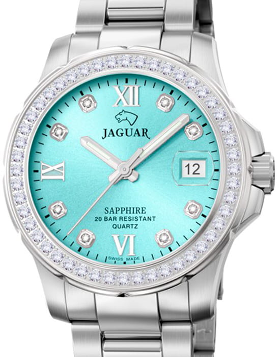 Jaguar J892/6 из коллекции Woman — элегантные женские часы, сочетающие швейцарское качество и изысканный дизайн. Корпус диаметром 34,5 мм выполнен из нержавеющей стали, что обеспечивает прочность и долговечность. Сапфировое стеклоСапфировое стеклоПрочный и надёжный материал из кристалла сапфира синтетического происхождения, характеризующийся особой твёрдостью и устойчивостью к царапинам и повреждениям. защищает циферблат от царапин. БезельБезельВнешний ободок, закрепляющий стекло. В спортивных часах так называется поворотное кольцо с делениями на циферблате, выполняет роль таймера – замеряет отрезки времени на шкале. Неподвижный безель – элемент декора. Однонаправленно вращающийся безель на дайверских часах позволяет фиксировать моменты погружения и выныривания на поверхность. украшен цирконами, что придаёт часам роскошный и элегантный вид. Синий циферблат с серебристыми стрелками и индексами, украшенными цирконами, подчёркивает изысканность дизайна. Часы оснащены функциями индикации дня недели и даты, что добавляет практичности. Браслет из нержавеющей стали обеспечивает комфортное ношение. Раскладная застёжкаРаскладная застёжкаТакой тип застёжки используется только на браслетах из металла. Она никогда не раскрывается полностью, происходит разделение на 2 и более частей. Раскладывающая застёжка снизит вероятность потери часов к минимуму. гарантирует надёжную фиксацию. Водозащита до 20 ATM (200 метров) делает часы подходящими для плавания и водных видов спорта. Jaguar J892/6 — это идеальный выбор для женщин, которые ценят элегантность, функциональность и швейцарское качество.