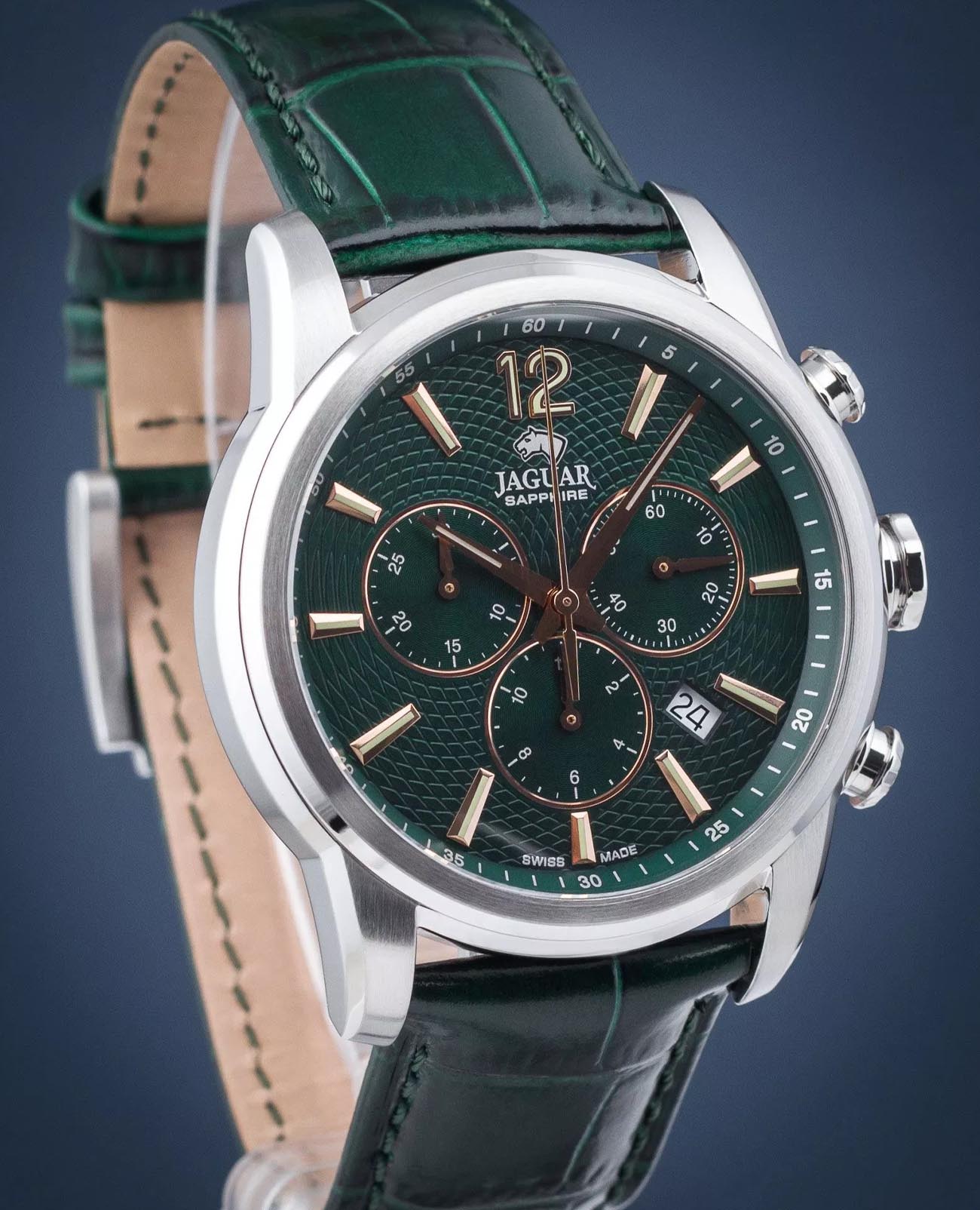 Мужские швейцарские часы-хронографХронографФункция позволяет измерять отрезки времени с особой точностью: часы, минуты, секунды. Верным признаком хронографа является наличие на циферблате 3 дополнительных окошек-счётчиков. Jaguar Acamar J968/3. Кварцевый швейцарский калибр RONDA 5030D. Сапфировое стеклоСапфировое стеклоПрочный и надёжный материал из кристалла сапфира синтетического происхождения, характеризующийся особой твёрдостью и устойчивостью к царапинам и повреждениям. устойчивое к мелким механическим повреждениям. Корпус часов изготовлен из нержавеющей стали. Окошко даты находится в положении между 4 и 5 часов. Класс водозащиты: 50 метров, позволит защитить корпус от случайных брызг или капель дождя. Кожаный ремешок на стандартной застёжке. Стрелки и метки с люминесцентным покрытиемЛюминесцентное покрытиеПозволяет считывать показания времени в темноте. Производители наносят на стрелки, часовые индексы, безель или поверхность циферблата светонакопительный состав, дающий холодное свечение..