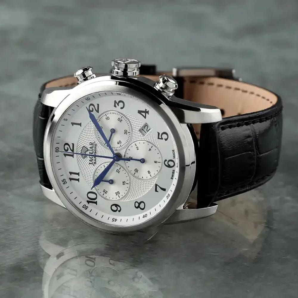 Мужские швейцарские часы-хронографХронографФункция позволяет измерять отрезки времени с особой точностью: часы, минуты, секунды. Верным признаком хронографа является наличие на циферблате 3 дополнительных окошек-счётчиков. Jaguar Acamar J968/7. Кварцевый швейцарский калибр RONDA 5030D. Сапфировое стеклоСапфировое стеклоПрочный и надёжный материал из кристалла сапфира синтетического происхождения, характеризующийся особой твёрдостью и устойчивостью к царапинам и повреждениям. устойчивое к мелким механическим повреждениям. Корпус часов изготовлен из нержавеющей стали. Окошко даты находится в положении между 4 и 5 часов. Класс водозащиты: 50 метров, позволит защитить корпус от случайных брызг или капель дождя. Кожаный ремешок на стандартной застёжке.