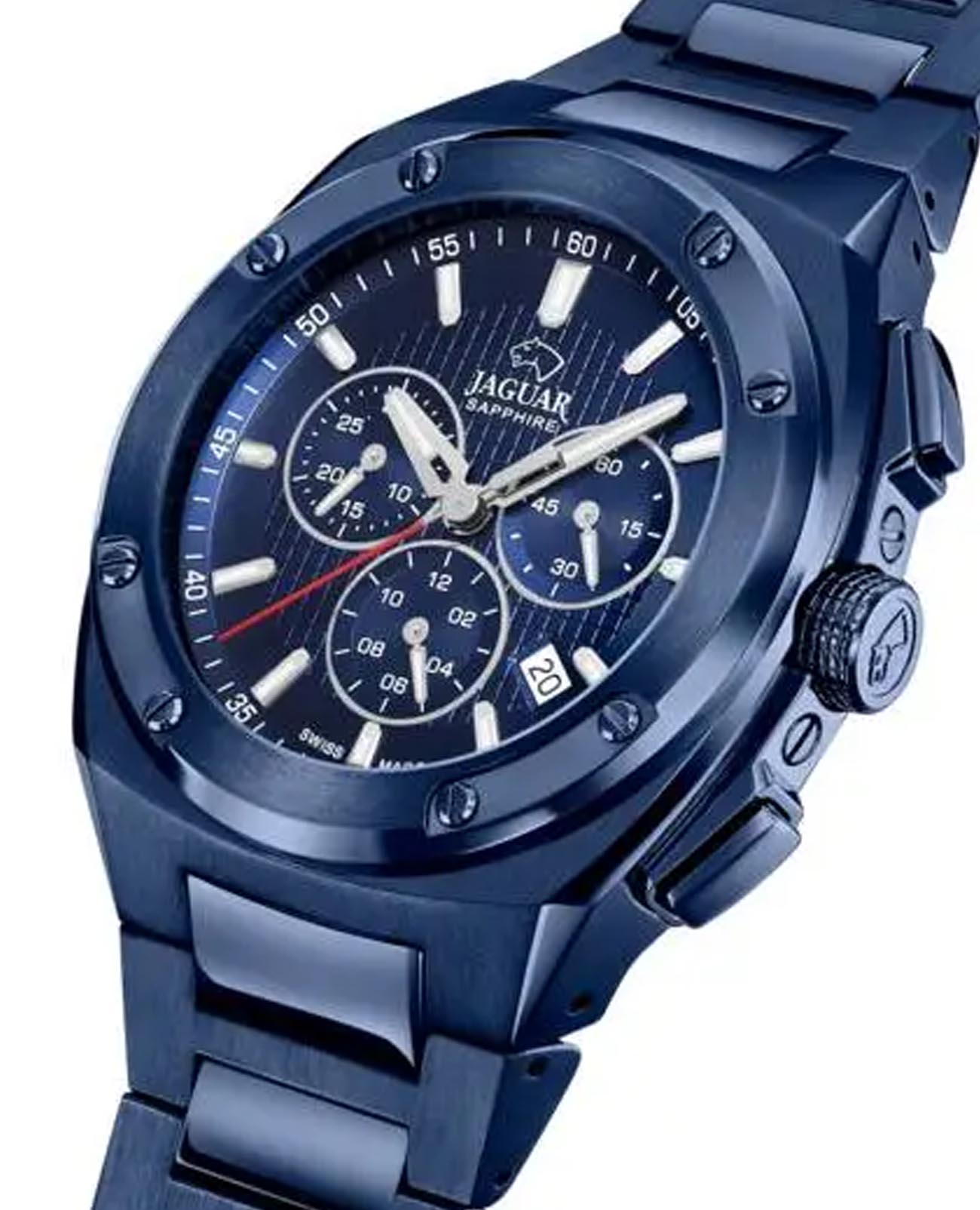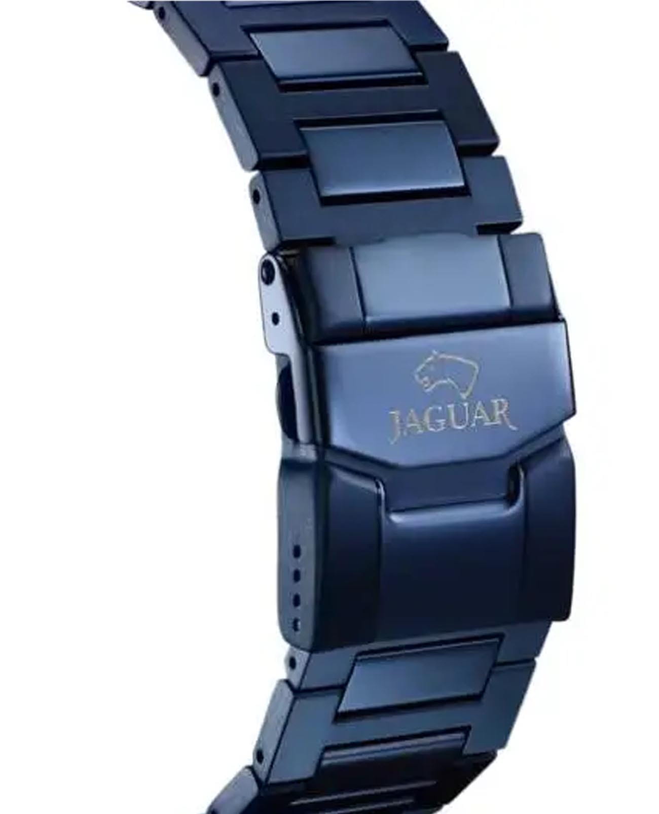 Мужские швейцарские часы-хронографХронографФункция позволяет измерять отрезки времени с особой точностью: часы, минуты, секунды. Верным признаком хронографа является наличие на циферблате 3 дополнительных окошек-счётчиков. Jaguar Executive J991/1. Кварцевый швейцарский калибр Ronda 5030d. Сапфировое стеклоСапфировое стеклоПрочный и надёжный материал из кристалла сапфира синтетического происхождения, характеризующийся особой твёрдостью и устойчивостью к царапинам и повреждениям. устойчивое к мелким механическим повреждениям. Корпус и браслет часов изготовлены из нержавеющей стали с PVD-покрытиемPVDУльтратонкое покрытие наносится в технике вакуумного напыления, сочетает в себе нитрид титана особой прочности со слоем золота или оксида хрома. Несёт в себе декоративную или защитную функцию.. Стрелки и метки с люминесцентным покрытиемЛюминесцентное покрытиеПозволяет считывать показания времени в темноте. Производители наносят на стрелки, часовые индексы, безель или поверхность циферблата светонакопительный состав, дающий холодное свечение.. Окошко даты находится в положении между «4» и «5 часами». Класс водозащиты: 50 метров, позволит защитить корпус от случайных брызг или капель дождя. Стальной браслет с PVD-покрытиемPVDУльтратонкое покрытие наносится в технике вакуумного напыления, сочетает в себе нитрид титана особой прочности со слоем золота или оксида хрома. Несёт в себе декоративную или защитную функцию. на раскладной застёжкеРаскладная застёжкаТакой тип застёжки используется только на браслетах из металла. Она никогда не раскрывается полностью, происходит разделение на 2 и более частей. Раскладывающая застёжка снизит вероятность потери часов к минимуму.. БезельБезельВнешний ободок, закрепляющий стекло. В спортивных часах так называется поворотное кольцо с делениями на циферблате, выполняет роль таймера – замеряет отрезки времени на шкале. Неподвижный безель – элемент декора. Однонаправленно вращающийся безель на дайверских часах позволяет фиксировать моменты погружения и выныривания на поверхность. с PVD-покрытиемPVDУльтратонкое покрытие наносится в технике вакуумного напыления, сочетает в себе нитрид титана особой прочности со слоем золота или оксида хрома. Несёт в себе декоративную или защитную функцию..