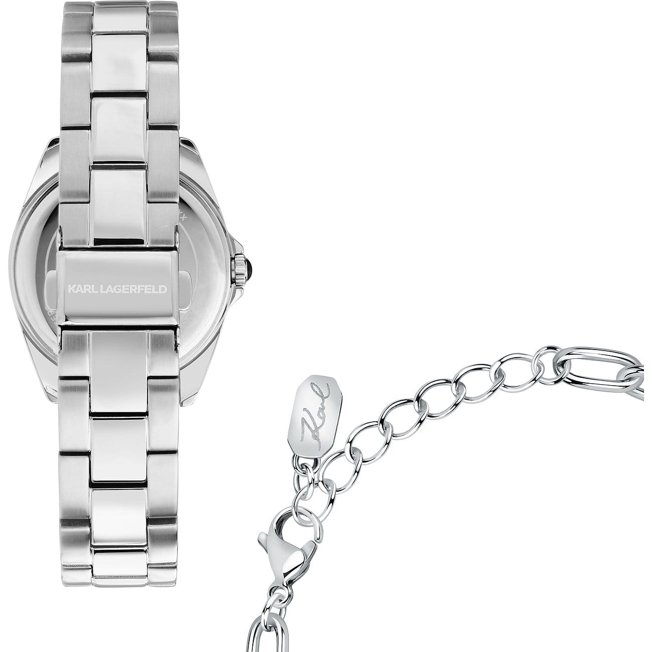 Женские элегантные часы Karl Lagerfeld Round Essentials R0553101516, кварцевый механизм с высокой точностью. Минеральное стеклоМинеральное стеклоМинеральное стекло представляет собой искусственно выращенный минерал кварца. Такое стекло отличается особой устойчивостью к повреждениям и царапинам. Уступает по некоторым качествам сапфировому стеклу. устойчивое к появлению царапин, обладающее высокой прозрачностью. Изысканный корпус изготовлен из нержавеющей стали. Лаконичные центральные часовая, минутная и секундная стрелки. Водонепроницаемость 5 АТМ позволяет использовать часы в повседневных условиях — при мытье рук или под лёгким дождём. Стальной браслет c раскладной застёжкойРаскладная застёжкаТакой тип застёжки используется только на браслетах из металла. Она никогда не раскрывается полностью, происходит разделение на 2 и более частей. Раскладывающая застёжка снизит вероятность потери часов к минимуму., обеспечивающей комфорт и уверенную фиксацию на запястье, а также добавляя завершающий штрих к этому стильному аксессуару. Стрелки и метки оснащены люминесцентным покрытиемЛюминесцентное покрытиеПозволяет считывать показания времени в темноте. Производители наносят на стрелки, часовые индексы, безель или поверхность циферблата светонакопительный состав, дающий холодное свечение., обеспечивающим хорошую читаемость в темноте. Циферблат с кристаллами подчёркивает изысканный характер часов, создавая универсальный образ, подходящий как для повседневных ситуаций, так и для особых случаев. Аккуратное окошко даты на отметке «3 часов». Набор с браслетом из нержавеющей стали.