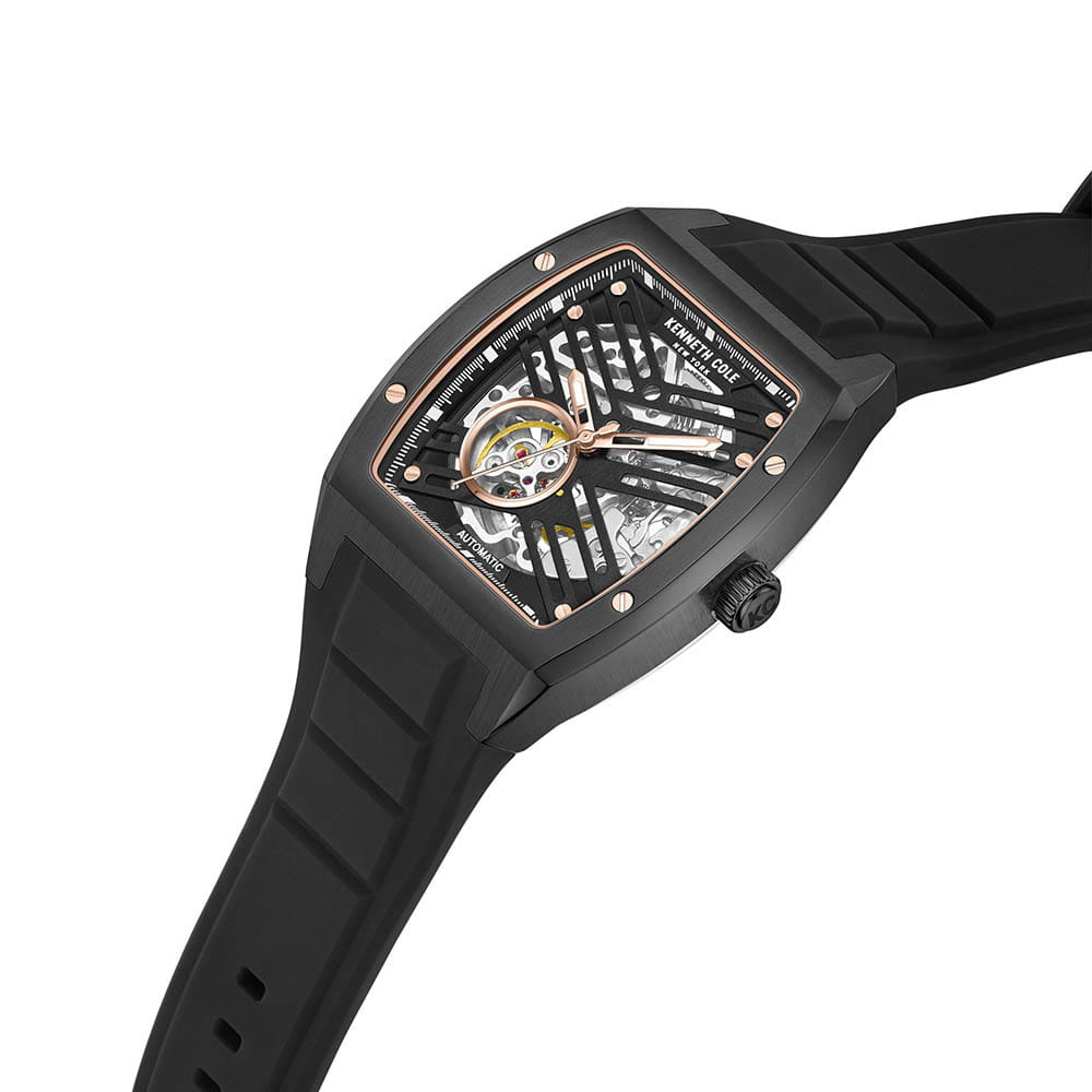 Мужские механические часы с автоподзаводом Kenneth Cole KCWGZ0046103 — это стильный и современный аксессуар с выразительным дизайном. Корпус прямоугольной формы (бочка) размером 40 × 52,5 мм выполнен из стали с IP-покрытиемIP-покрытиеМетод ионного напыления. Демонстрирует повышенную устойчивость к истиранию, окислению и химическим веществам. Под воздействием высокого давления и температуры около 1500°C молекулы металла надёжно соединяются с частицами корпуса часов. чёрного цвета. Циферблат чёрного цвета частично скелетонизирован, что позволяет наблюдать за работой механизма. Циферблат защищён минеральным стекломМинеральное стеклоМинеральное стекло представляет собой искусственно выращенный минерал кварца. Такое стекло отличается особой устойчивостью к повреждениям и царапинам. Уступает по некоторым качествам сапфировому стеклу. и оформлен метками в виде штрихов. Стрелки с люминесцентным покрытиемЛюминесцентное покрытиеПозволяет считывать показания времени в темноте. Производители наносят на стрелки, часовые индексы, безель или поверхность циферблата светонакопительный состав, дающий холодное свечение. обеспечивают хорошую читаемость в темноте. Часы оснащены силиконовым ремешком чёрного цвета с классической пряжкой. Водонепроницаемость 50 м позволяет использовать часы для плавания и повседневного ношения. Сочетание стиля, надёжности и современного дизайна.