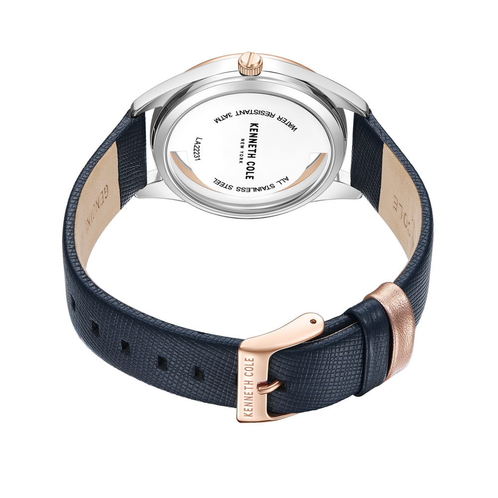 Женские кварцевые часы Kenneth Cole KCWLA2223105 — это стильный и необычный аксессуар с современным дизайном. Корпус диаметром 36 мм выполнен из нержавеющей стали. Безель с IP-покрытиемIP-покрытиеМетод ионного напыления. Демонстрирует повышенную устойчивость к истиранию, окислению и химическим веществам. Под воздействием высокого давления и температуры около 1500°C молекулы металла надёжно соединяются с частицами корпуса часов. розового золота. Циферблат стального цвета дополнен малой секундной стрелкой, что придаёт классическому дизайну изысканности. Циферблат защищён минеральным стекломМинеральное стеклоМинеральное стекло представляет собой искусственно выращенный минерал кварца. Такое стекло отличается особой устойчивостью к повреждениям и царапинам. Уступает по некоторым качествам сапфировому стеклу.. Особенностью модели является прозрачный корпус, добавляющий оригинальности и визуальной лёгкости. Часы оснащены ремешком из натуральной кожи синего цвета с классической пряжкой. Водонепроницаемость 30 м позволяет использовать часы в повседневных условиях, защищая от случайных брызг и капель дождя. Уникальный внешний вид и внимание к деталям делают эти часы идеальным выбором для тех, кто ценит индивидуальность.