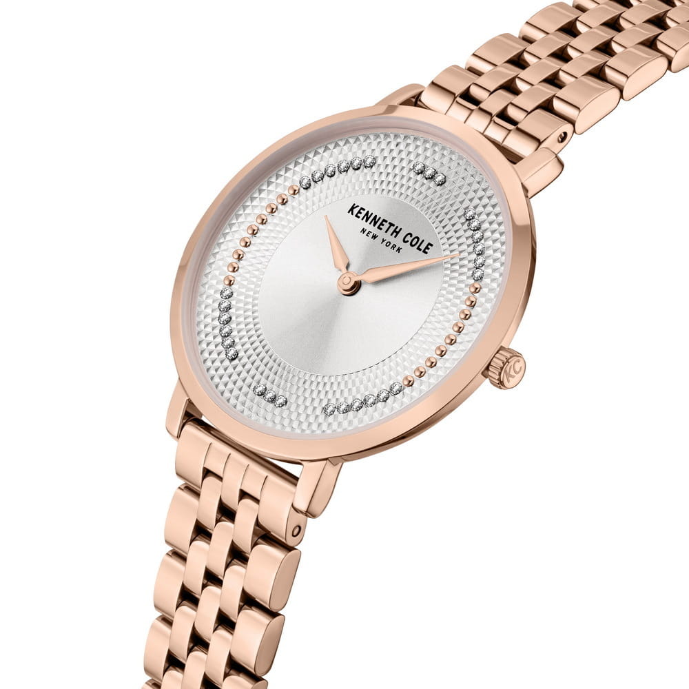 Женские кварцевые часы Kenneth Cole KCWLG0048101 — это элегантный аксессуар, подчеркивающий женственность и стиль. Корпус диаметром 34 мм выполнен из стали с IP-покрытиемIP-покрытиеМетод ионного напыления. Демонстрирует повышенную устойчивость к истиранию, окислению и химическим веществам. Под воздействием высокого давления и температуры около 1500°C молекулы металла надёжно соединяются с частицами корпуса часов. розового золота. Циферблат стального цвета украшен вставками из стразов из стекла, придающими сияние и изысканность. Циферблат защищён минеральным стекломМинеральное стеклоМинеральное стекло представляет собой искусственно выращенный минерал кварца. Такое стекло отличается особой устойчивостью к повреждениям и царапинам. Уступает по некоторым качествам сапфировому стеклу.. Часы оснащены стальным браслетом с IP-покрытиемIP-покрытиеМетод ионного напыления. Демонстрирует повышенную устойчивость к истиранию, окислению и химическим веществам. Под воздействием высокого давления и температуры около 1500°C молекулы металла надёжно соединяются с частицами корпуса часов. розового золота на раскладной застёжкеРаскладная застёжкаТакой тип застёжки используется только на браслетах из металла. Она никогда не раскрывается полностью, происходит разделение на 2 и более частей. Раскладывающая застёжка снизит вероятность потери часов к минимуму.. Водонепроницаемость 30 м позволяет использовать часы в повседневных условиях, защищая от случайных брызг и капель дождя. Утончённый образ и внимание к деталям делают эти часы идеальным дополнением к любому образу.