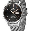 Российские мужские механические часы Космос K 043.10.35 с автоподзаводом оснащены корпусом из нержавеющей стали 316L диаметром 41 мм и защищены минеральным стекломМинеральное стеклоМинеральное стекло представляет собой искусственно выращенный минерал кварца. Такое стекло отличается особой устойчивостью к повреждениям и царапинам. Уступает по некоторым качествам сапфировому стеклу.. Дополнен функциями отображения даты и дня недели. Заводная головка декорирована логотипом бренда в виде стилизованного изображения планеты. Часы имеют водонепроницаемость 50 метров, позволит защитить корпус от случайных брызг или капель дождя. Модель комплектуется браслетом из нержавеющей стали 316L с миланским плетением на раскладном замкеРаскладной замокДанный вариант застежки используется только на часах с металлическим браслетом. Отличительная особенность такого крепления в том, что длина браслета становится универсальной и вы можете самостоятельно отрегулировать нужный вам размер – застежка просто двигается по браслету часов.. Специальные крепежи позволяют легко заменить браслет на часах самостоятельно. Прочный корпус и надежный механизм делают эти часы универсальным аксессуаром для повседневного использования. Уникальный дизайн и высокое качество материалов подчеркивают индивидуальность владельца.