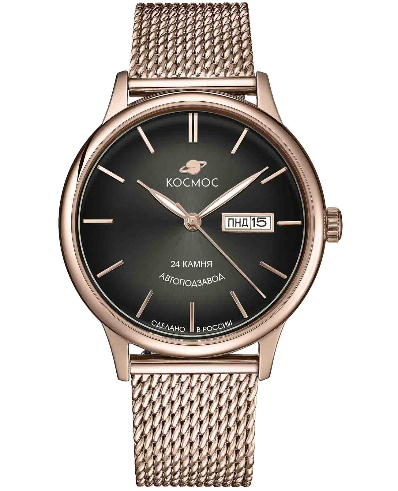 Российские мужские механические часы Космос K 043.40.31 из коллекции Юпитер оснащены механизмом TMI с автоподзаводом на 24 рубинах. Полированный корпус из нержавеющей стали 316L с PVD-покрытиемPVDУльтратонкое покрытие наносится в технике вакуумного напыления, сочетает в себе нитрид титана особой прочности со слоем золота или оксида хрома. Несёт в себе декоративную или защитную функцию. розового золота диаметром 41 мм и толщиной 14 мм защищен минеральным стекломМинеральное стеклоМинеральное стекло представляет собой искусственно выращенный минерал кварца. Такое стекло отличается особой устойчивостью к повреждениям и царапинам. Уступает по некоторым качествам сапфировому стеклу., выпуклым с обеих сторон, что придает ему сходство с силуэтом летающей тарелки. Черный циферблат с градиентной шлифовкой в стиле солнечных лучей украшен изготовленными вручную индексами, крепящимися на двух штифтах. Часовая, минутная стрелки и круг по краю циферблата имеют люминесцентное покрытиеЛюминесцентное покрытиеПозволяет считывать показания времени в темноте. Производители наносят на стрелки, часовые индексы, безель или поверхность циферблата светонакопительный состав, дающий холодное свечение., которое светится в темноте, создавая эффект ореола вокруг Земли. Модель дополнена функциями отображения даты и дня недели. Прозрачная задняя крышка позволяет наблюдать за работой механизма. Часы имеют водонепроницаемость 50 метров, позволит защитить корпус от случайных брызг или капель дождя. Модель комплектуется стальным браслетом миланского плетения на раскладном замкеРаскладной замокДанный вариант застежки используется только на часах с металлическим браслетом. Отличительная особенность такого крепления в том, что длина браслета становится универсальной и вы можете самостоятельно отрегулировать нужный вам размер – застежка просто двигается по браслету часов. с дополнительной защитой от случайного падения. Заводная головка, застежка и браслет украшены фирменным логотипом. Эти часы уникальны, сочетая в себе современные технологии и футуристический дизайн, вдохновленный эпохой покорения космоса. Они станут идеальным выбором для ценителей высокого качества и глубокого смысла в каждой детали.
