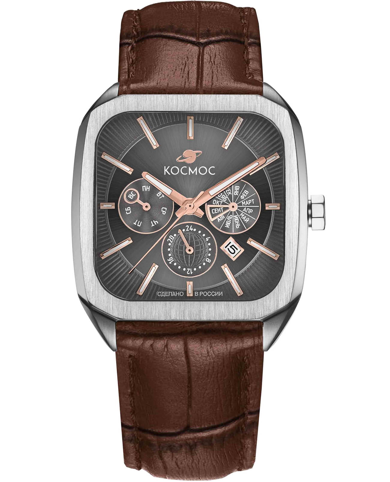Мужские наручные часы Космос Марсоход II K 219.12.34 — это уникальная лимитированная серия, посвященная аппарату, способному передвигаться по поверхности Красной планеты. Марсоход ассоциируется с брутальностью, мастерством и технической сложностью. Наша страна дважды запускала подобные аппараты еще в 70-х годах прошлого века. Дизайн часов серии Марсоход вдохновлен лучшими работами советских мастеров, сочетая современные технологии часового искусства с обаянием стиля ретро. Корпус в форме квадрата с закругленными углами выполнен из нержавеющей стали украшенной зеркальной полировкой и сатинированием. Удобная заводная головка имеет форму гайки, что добавляет модели индустриальный шарм. Задняя крышка прозрачная, закрепленная на четырех винтах, и позволяет увидеть работу механизма TMI с подвижным ротором, на котором гравируется надпись «Сделано в России». Также здесь представлена гравировка с изображением космонавта, придающая часам особую значимость. Водостойкость достигает 10 атм (WR100), что позволяет использовать часы при плавании и других водных видах спорта. На задней крышке указан индивидуальный номер модели в формате от 01/50 до 50/50. Объемный циферблат состоит из двух уровней. В центре движутся три стрелки, часовая и минутная из которых имеют люминесцентное покрытиеЛюминесцентное покрытиеПозволяет считывать показания времени в темноте. Производители наносят на стрелки, часовые индексы, безель или поверхность циферблата светонакопительный состав, дающий холодное свечение., позволяющее определять время даже в темноте. Также, здесь расположили три дополнительных индикатора: день недели, месяц и время в формате 24-х часов. Для обозначения дня недели и месяца используется кириллица. Окошко даты между 4 и 5 часами выделено накладной рамкой. Циферблат защищен прочным сапфировым стеклом с антибликовым покрытиемСапфировое стеклоПрочный и надёжный материал из кристалла сапфира синтетического происхождения, характеризующийся особой твёрдостью и устойчивостью к царапинам и повреждениям., обеспечивающим отличную читаемость показаний в любых условиях. Второй уровень декорирован гильоше в виде солнечных лучей, на нем закреплены накладные индексы. Браслет изготовлен из натуральной кожи коричневого цвета и оснащен удобной застёжкой «бабочка» с кнопкамиЗастёжка "бабочка"Такой вид застёжки дополняется предохранителями, помогающими избежать случайного раскрытия браслета. Обладают изящным исполнением. , которая сводит к минимуму вероятность потери. Заводная головка, застежка и браслет украшены фирменным логотипом бренда. Коллекция Марсоход — идеальный выбор для ценителей истории космических достижений и современных технологий.
