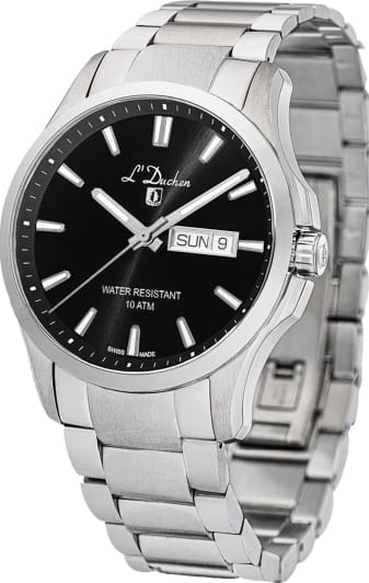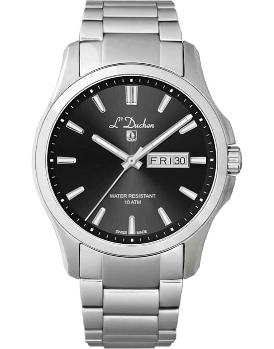 Мужские швейцарские часы L'Duchen Dynamique D 261.10.31, кварцевый механизм с высокой точностью. Сапфировое стеклоСапфировое стеклоПрочный и надёжный материал из кристалла сапфира синтетического происхождения, характеризующийся особой твёрдостью и устойчивостью к царапинам и повреждениям. устойчивое к появлению царапин, обладающее высокой прозрачностью. Корпус часов выполнен из нержавеющей стали. Стрелки с люминесцентным покрытиемЛюминесцентное покрытиеПозволяет считывать показания времени в темноте. Производители наносят на стрелки, часовые индексы, безель или поверхность циферблата светонакопительный состав, дающий холодное свечение.. Класс водозащиты: 100 метров, позволит плавать, нырять и заниматься другими водными видами спорта. Стальной браслет на застёжке «бабочка» с кнопкамиЗастёжка "бабочка"Такой вид застёжки дополняется предохранителями, помогающими избежать случайного раскрытия браслета. Обладают изящным исполнением. .