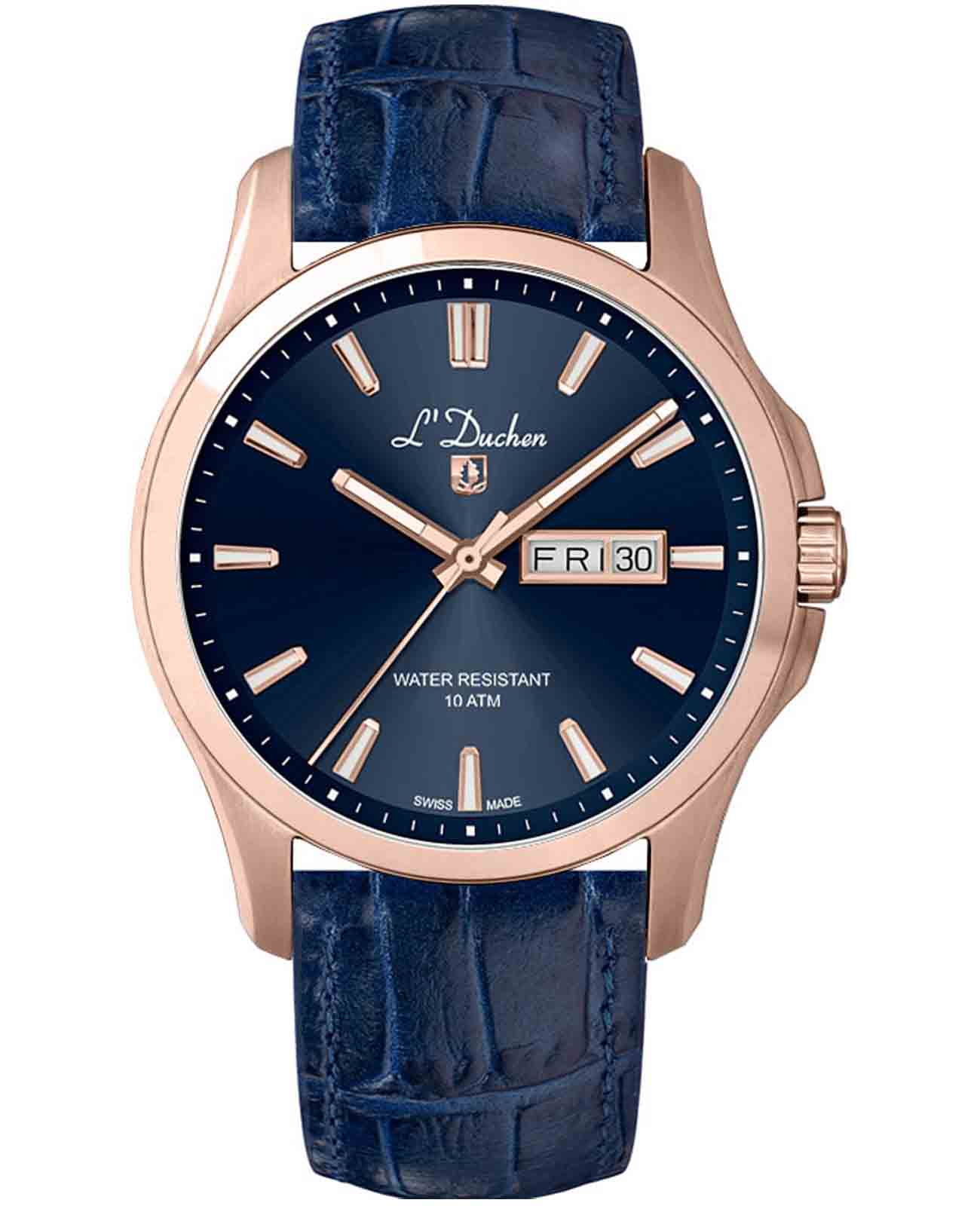 Мужские швейцарские часы L'Duchen Dynamique D 261.46.36, кварцевый механизм с высокой точностью. Сапфировое стеклоСапфировое стеклоПрочный и надёжный материал из кристалла сапфира синтетического происхождения, характеризующийся особой твёрдостью и устойчивостью к царапинам и повреждениям. устойчивое к появлению царапин, обладающее высокой прозрачностью. Корпус часов выполнен из нержавеющей стали с PVD-покрытиемPVDУльтратонкое покрытие наносится в технике вакуумного напыления, сочетает в себе нитрид титана особой прочности со слоем золота или оксида хрома. Несёт в себе декоративную или защитную функцию.. Стрелки с люминесцентным покрытиемЛюминесцентное покрытиеПозволяет считывать показания времени в темноте. Производители наносят на стрелки, часовые индексы, безель или поверхность циферблата светонакопительный состав, дающий холодное свечение.. Окошко даты находится в положении 3 часа.  Класс водозащиты: 100 метров, позволит плавать, нырять и заниматься другими водными видами спорта. Кожаный ремешок на застёжке «бабочка» с кнопкамиЗастёжка "бабочка"Такой вид застёжки дополняется предохранителями, помогающими избежать случайного раскрытия браслета. Обладают изящным исполнением. .