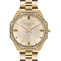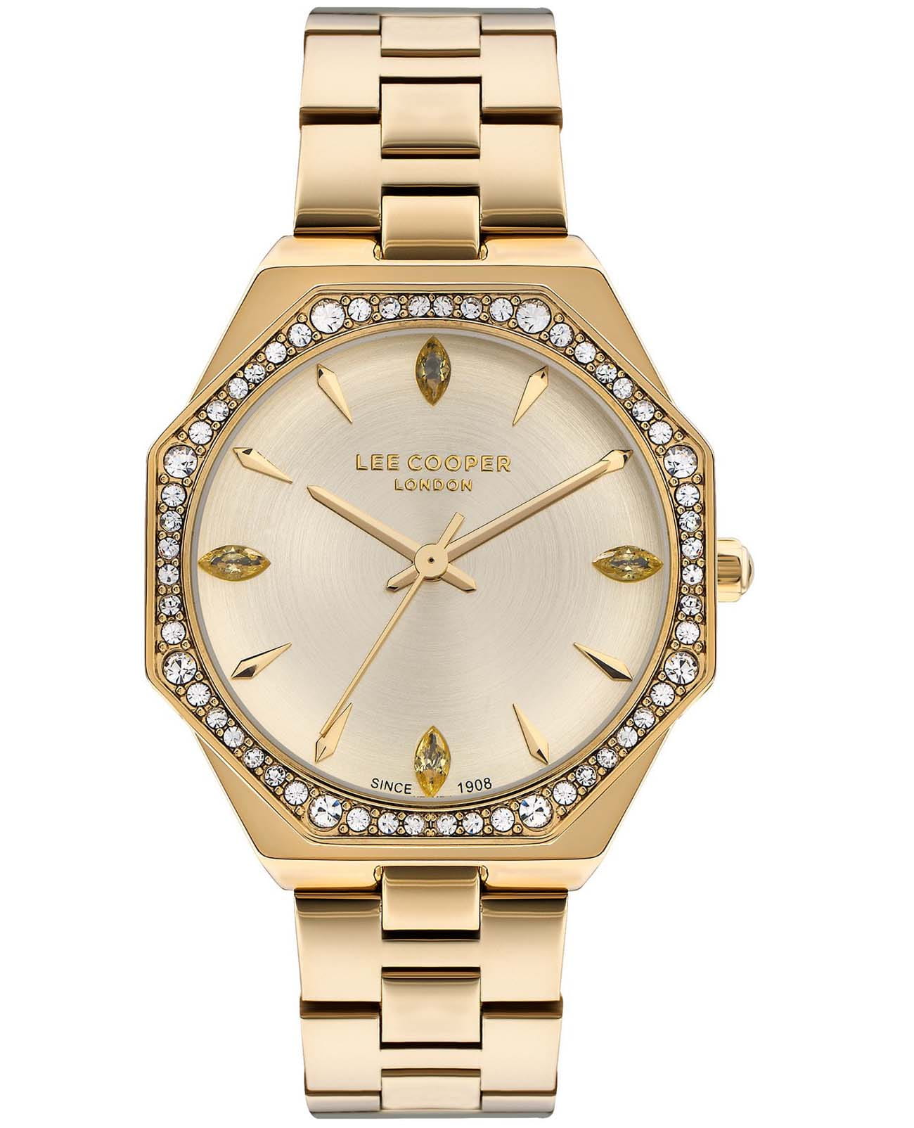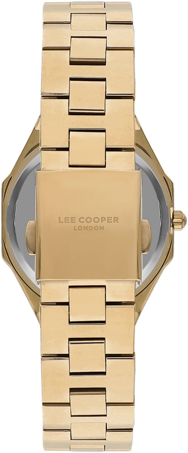 Женские часы Lee Cooper LC07599.110 — это стильное сочетание элегантности и современного дизайна. Круглый корпус диаметром 35 мм выполнен из суперметалла с IP-покрытиемIP-покрытиеМетод ионного напыления. Демонстрирует повышенную устойчивость к истиранию, окислению и химическим веществам. Под воздействием высокого давления и температуры около 1500°C молекулы металла надёжно соединяются с частицами корпуса часов. золотистого цвета. Циферблат защищен минеральным стекломМинеральное стеклоМинеральное стекло представляет собой искусственно выращенный минерал кварца. Такое стекло отличается особой устойчивостью к повреждениям и царапинам. Уступает по некоторым качествам сапфировому стеклу., обеспечивающий устойчивость к царапинам. Неподвижный безельБезельВнешний ободок, закрепляющий стекло. В спортивных часах так называется поворотное кольцо с делениями на циферблате, выполняет роль таймера – замеряет отрезки времени на шкале. Неподвижный безель – элемент декора. Однонаправленно вращающийся безель на дайверских часах позволяет фиксировать моменты погружения и выныривания на поверхность. и циферблат инкрустированы цирконами. Центральные часовая, минутная и секундная стрелки. Часы оснащены надежным кварцевым механизмом, источник питания - батарейка. Металлический браслет на раскладной застёжкеРаскладная застёжкаТакой тип застёжки используется только на браслетах из металла. Она никогда не раскрывается полностью, происходит разделение на 2 и более частей. Раскладывающая застёжка снизит вероятность потери часов к минимуму. гарантирует комфортную посадку на запястье. Водозащита 30 метров защищает модель от случайных брызг и дождя. Lee Cooper  — отличный выбор для тех, кто ценит утонченность и качество.