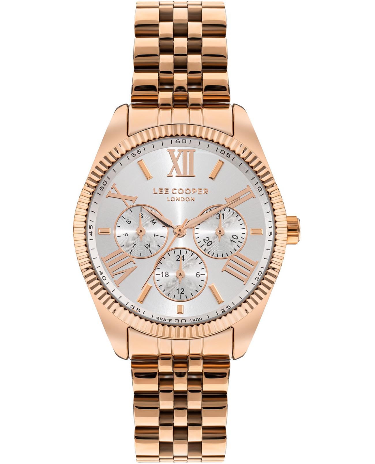Женские часы Lee Cooper LC07811.430 — это стильное сочетание элегантности и современного дизайна. Корпус диаметром 37 мм выполнен из суперметалла с IP-покрытиемIP-покрытиеМетод ионного напыления. Демонстрирует повышенную устойчивость к истиранию, окислению и химическим веществам. Под воздействием высокого давления и температуры около 1500°C молекулы металла надёжно соединяются с частицами корпуса часов. цвета розового золота, придающий модели особый блеск. Изысканный серебристый циферблат защищен минеральным стекломМинеральное стеклоМинеральное стекло представляет собой искусственно выращенный минерал кварца. Такое стекло отличается особой устойчивостью к повреждениям и царапинам. Уступает по некоторым качествам сапфировому стеклу., обеспечивающим устойчивость к царапинам. Метки в виде римских цифр. Вынесенный циферблат с 24-х часовым указателем времени, индикацией даты и дня недели. Часы оснащены надежным кварцевым механизмом, а стальной браслет с IP-покрытиемIP-покрытиеМетод ионного напыления. Демонстрирует повышенную устойчивость к истиранию, окислению и химическим веществам. Под воздействием высокого давления и температуры около 1500°C молекулы металла надёжно соединяются с частицами корпуса часов. на раскладной застёжкеРаскладная застёжкаТакой тип застёжки используется только на браслетах из металла. Она никогда не раскрывается полностью, происходит разделение на 2 и более частей. Раскладывающая застёжка снизит вероятность потери часов к минимуму. гарантирует комфортную посадку на запястье. Водозащита 50 метров защищает модель от случайных брызг и дождя. Lee Cooper  — отличный выбор для тех, кто ценит утонченность и качество.
