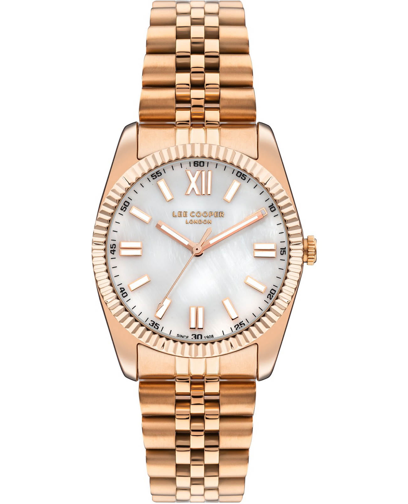 Женские часы Lee Cooper LC07824.420 выполнены в классическом стиле и сочетают строгий дизайн с надёжным механизмом. Модель оснащена кварцевым механизмом, обеспечивающим точность хода и минимальное обслуживание. Изящный корпус имеет размер 36 мм, изготовлен из суперметалла с IP-покрытиемIP-покрытиеМетод ионного напыления. Демонстрирует повышенную устойчивость к истиранию, окислению и химическим веществам. Под воздействием высокого давления и температуры около 1500°C молекулы металла надёжно соединяются с частицами корпуса часов., гарантирует комфорт при ношении. Перламутровый циферблат дополнен штрихами и римскими цифрами для чёткого отсчёта времени. Защиту циферблата обеспечивает минеральное стеклоМинеральное стеклоМинеральное стекло представляет собой искусственно выращенный минерал кварца. Такое стекло отличается особой устойчивостью к повреждениям и царапинам. Уступает по некоторым качествам сапфировому стеклу., устойчивое к мелким механическим повреждениям. Стальной браслет с IP-покрытиемIP-покрытиеМетод ионного напыления. Демонстрирует повышенную устойчивость к истиранию, окислению и химическим веществам. Под воздействием высокого давления и температуры около 1500°C молекулы металла надёжно соединяются с частицами корпуса часов. на раскладной застёжкеРаскладная застёжкаТакой тип застёжки используется только на браслетах из металла. Она никогда не раскрывается полностью, происходит разделение на 2 и более частей. Раскладывающая застёжка снизит вероятность потери часов к минимуму. гарантирует удобную посадку и надёжную фиксацию на запястье. Стрелки и метки с люминесцентным покрытиемЛюминесцентное покрытиеПозволяет считывать показания времени в темноте. Производители наносят на стрелки, часовые индексы, безель или поверхность циферблата светонакопительный состав, дающий холодное свечение., обеспечивающим хорошую читаемость в темноте.Водозащита 30WR позволяет использовать часы в повседневных условиях без риска повреждения от случайных брызг воды. Это сочетание классического дизайна, прочности материалов и качества исполнения для уверенных в себе женщин.