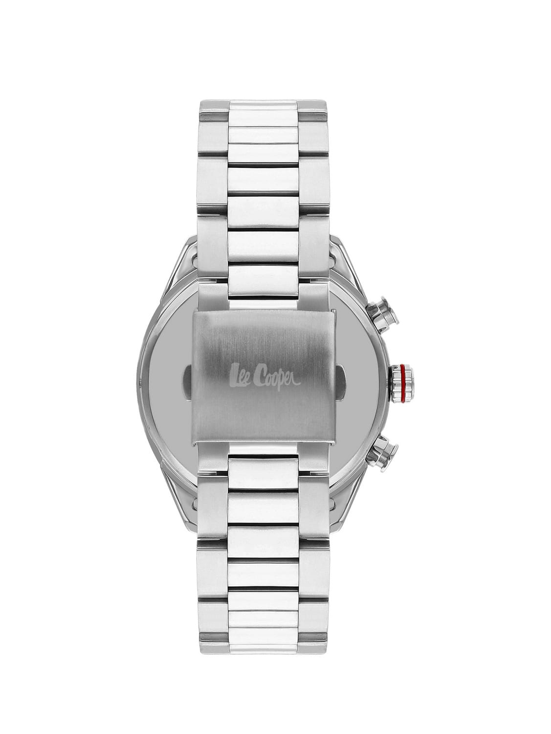 Мужские часы Lee Cooper LC07834.350 — это стильное сочетание элегантности и современного дизайна. Круглый корпус диаметром 45 мм выполнен из суперметалла, который придает модели особый изысканный вид. Циферблат защищен минеральным стекломМинеральное стеклоМинеральное стекло представляет собой искусственно выращенный минерал кварца. Такое стекло отличается особой устойчивостью к повреждениям и царапинам. Уступает по некоторым качествам сапфировому стеклу., обеспечивающим устойчивость к царапинам. Метки в виде штрихов. Часы оснащены надежным кварцевым механизмом, а стальной браслет на раскладной застёжкеРаскладная застёжкаТакой тип застёжки используется только на браслетах из металла. Она никогда не раскрывается полностью, происходит разделение на 2 и более частей. Раскладывающая застёжка снизит вероятность потери часов к минимуму. гарантирует комфортную посадку на запястье. Стрелки с люминесцентным покрытиемЛюминесцентное покрытиеПозволяет считывать показания времени в темноте. Производители наносят на стрелки, часовые индексы, безель или поверхность циферблата светонакопительный состав, дающий холодное свечение. позволяют легко считывать время даже в условиях недостаточного освещения. Мультифункциональная модель с индикацией даты, дня недели, с дополнительным 24-х часовым индикатором. Водозащита 50 метров позволит защитить корпус от случайных брызг или капель дождя. Lee Cooper  — отличный выбор для тех, кто ценит утонченность и качество.