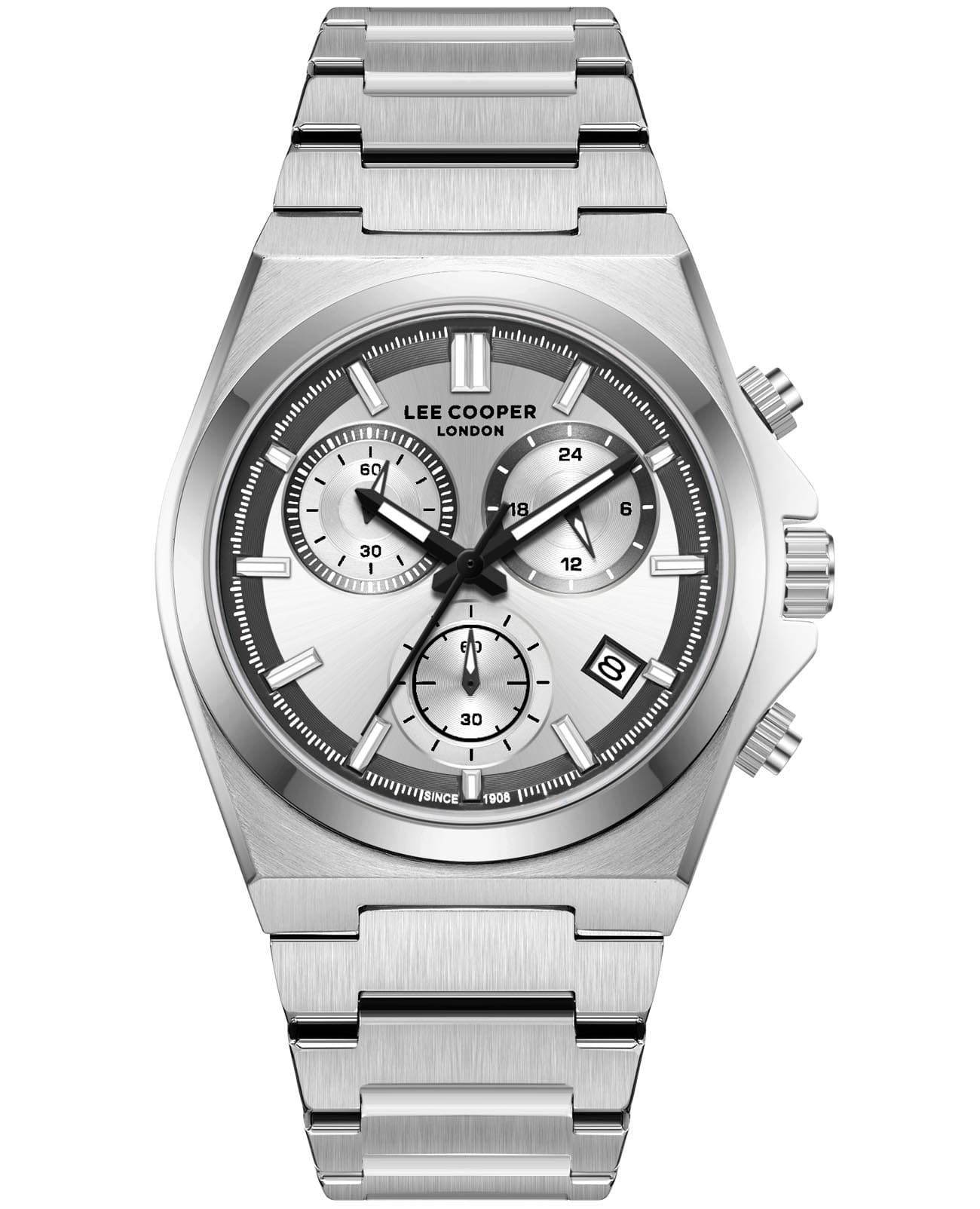 Мужские наручные часы-хронографХронографФункция позволяет измерять отрезки времени с особой точностью: часы, минуты, секунды. Верным признаком хронографа является наличие на циферблате 3 дополнительных окошек-счётчиков. Lee Cooper LC08188.330 оснащены кварцевым механизмом, обеспечивающий высокую точность хода и надежность. Элегантный корпус часов выполнен из суперметалла серебристого цвета, что делает их устойчивыми к внешним воздействиям и придает благородный вид. Циферблат украшен классическими стрелками и метками с люминесцентным покрытиемЛюминесцентное покрытиеПозволяет считывать показания времени в темноте. Производители наносят на стрелки, часовые индексы, безель или поверхность циферблата светонакопительный состав, дающий холодное свечение., гармонично дополняющим общий дизайн модели. Для защиты циферблата используется минеральное стеклоМинеральное стеклоМинеральное стекло представляет собой искусственно выращенный минерал кварца. Такое стекло отличается особой устойчивостью к повреждениям и царапинам. Уступает по некоторым качествам сапфировому стеклу., устойчивое к царапинам и механическим повреждениям. Корпус имеет круглую форму диаметром 41 мм, что делает часы заметными и подходящими. Браслет из стали оснащен раскладной застёжкойРаскладная застёжкаТакой тип застёжки используется только на браслетах из металла. Она никогда не раскрывается полностью, происходит разделение на 2 и более частей. Раскладывающая застёжка снизит вероятность потери часов к минимуму., обеспечивающим комфортное и безопасное ношение. Вынесенный циферблат с 24-х часовым указателем времени, индикацией даты и дня недели. Окошко даты находится в положении между 4 и 5 часов. Часы обладают водонепроницаемостью до 30 метров (3 АТМ), что позволяет использовать их в повседневной жизни, включая контакт с водой при мытье рук или дожде. Эти часы станут идеальным выбором для мужчин, ценящих стиль, качество и функциональность.