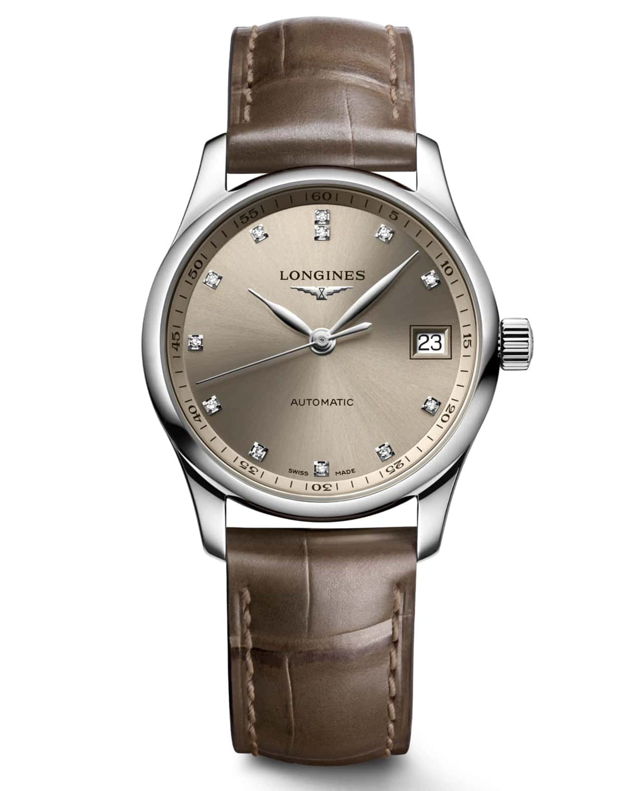Швейцарские механические часы Longines Master Collection L2.357.4.07.2. Сапфировое стеклоСапфировое стеклоПрочный и надёжный материал из кристалла сапфира синтетического происхождения, характеризующийся особой твёрдостью и устойчивостью к царапинам и повреждениям. устойчивое к появлению царапин, обладающее высокой прозрачностью. Корпус часов изготовлен из нержавеющей стали. Циферблат с 12 бриллиантами группы Top Wesselton VS-SI общим весом 0.055 карата. Окошко даты в положении 3 часа. Автоматический механизм с частотой баланса 25 200 полуколебаний в час и запасом хода, которого хватает примерно на 72 часа работы. Класс водозащиты: 30 метров, позволит защитить корпус от случайных брызг или капель дождя. Ремешок из кожи аллигатора на застёжке «бабочка» с кнопкамиЗастёжка "бабочка"Такой вид застёжки дополняется предохранителями, помогающими избежать случайного раскрытия браслета. Обладают изящным исполнением. .
