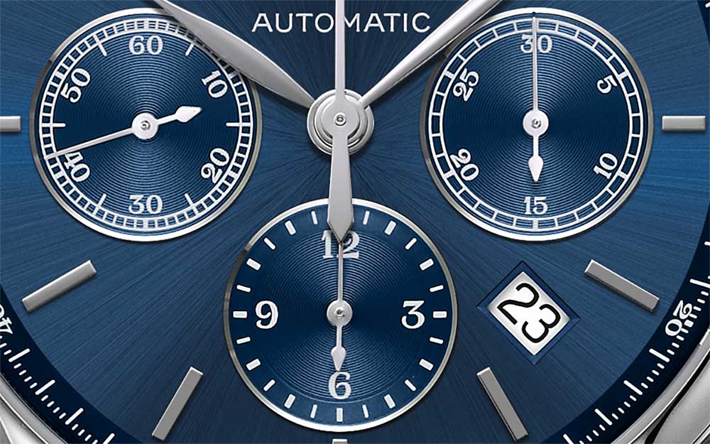 Современный хронографХронографФункция позволяет измерять отрезки времени с особой точностью: часы, минуты, секунды. Верным признаком хронографа является наличие на циферблате 3 дополнительных окошек-счётчиков. с гильошированным циферблатом barleycorn дополнен ремешком из натуральной кожи. Швейцарский автоматический механизм L688 отличается 54-часовым резервом хода. Сохраняется водозащита до 3 бар.