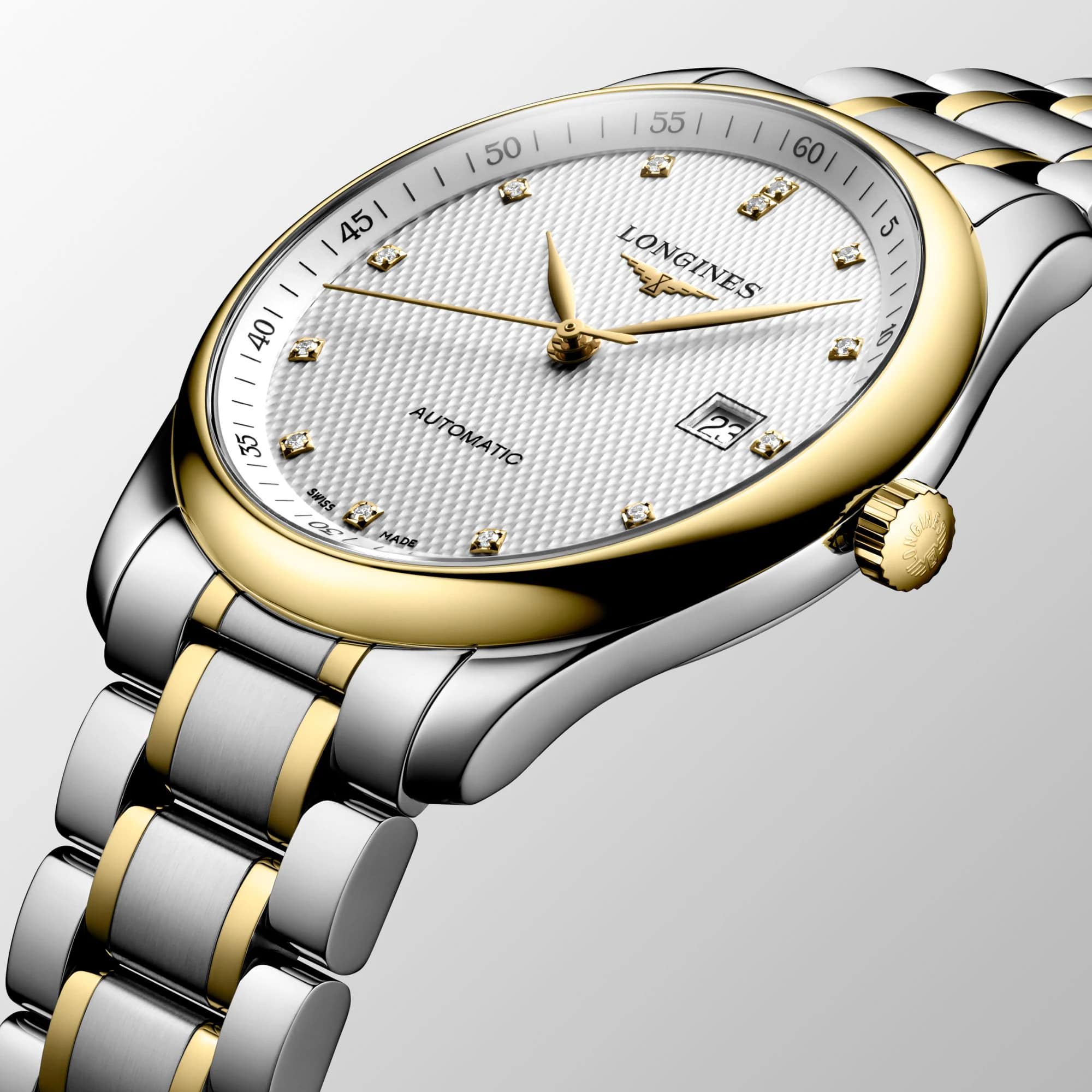Женские швейцарские механические часы с автоподзаводом Longines Master Collection L2.793.5.97.7. Сапфировое стеклоСапфировое стеклоПрочный и надёжный материал из кристалла сапфира синтетического происхождения, характеризующийся особой твёрдостью и устойчивостью к царапинам и повреждениям. устойчивое к появлению царапин, обладающее высокой прозрачностью. Корпус часов изготовлен из нержавеющей стали и 18-каратного золота18-каратное золотоОбозначение по каратной системе пробирования, оно показывает, сколько драгоценного металла содержится в изделии. 18 карат - в составе 75% чистого золота, соответствует 750 пробе.