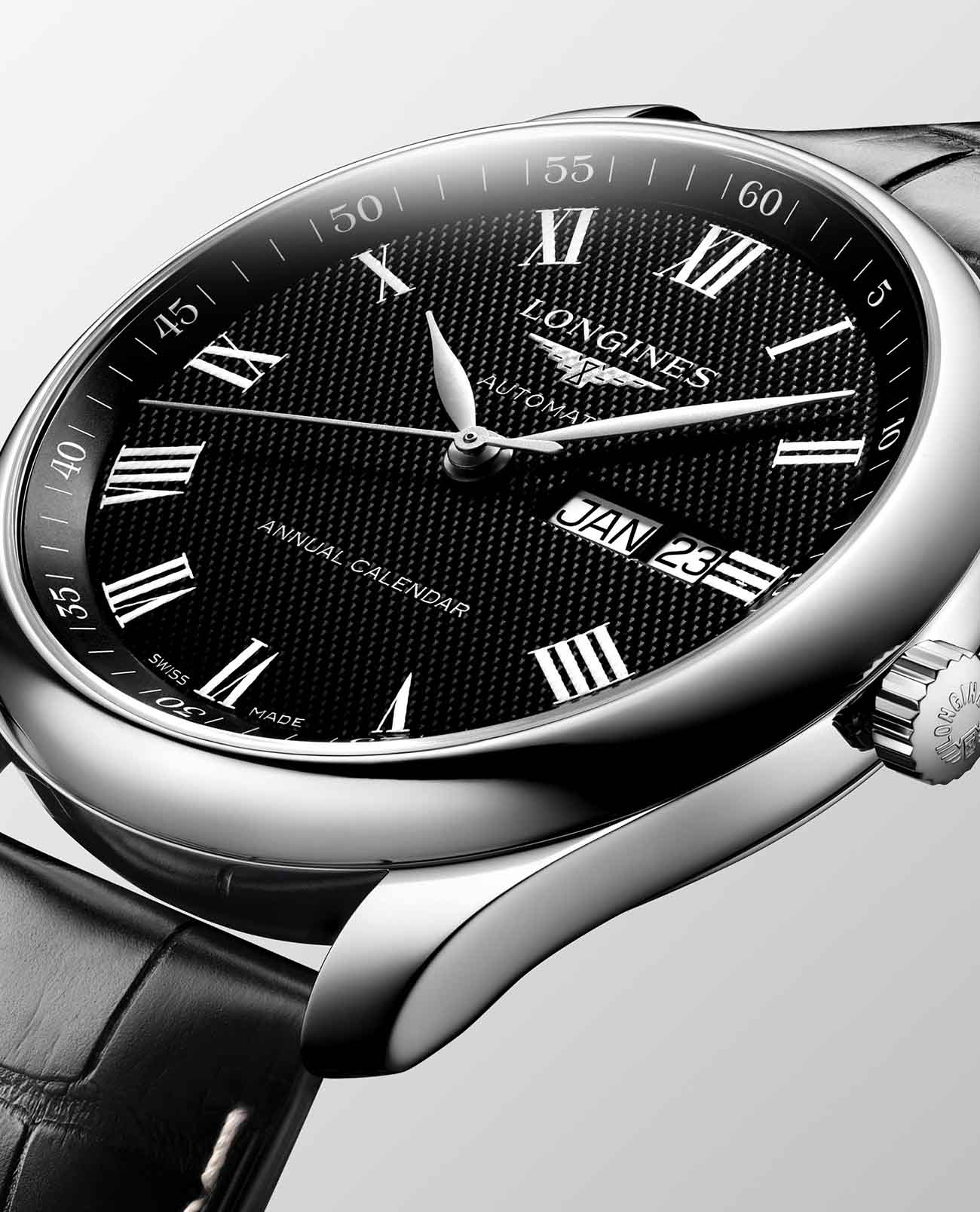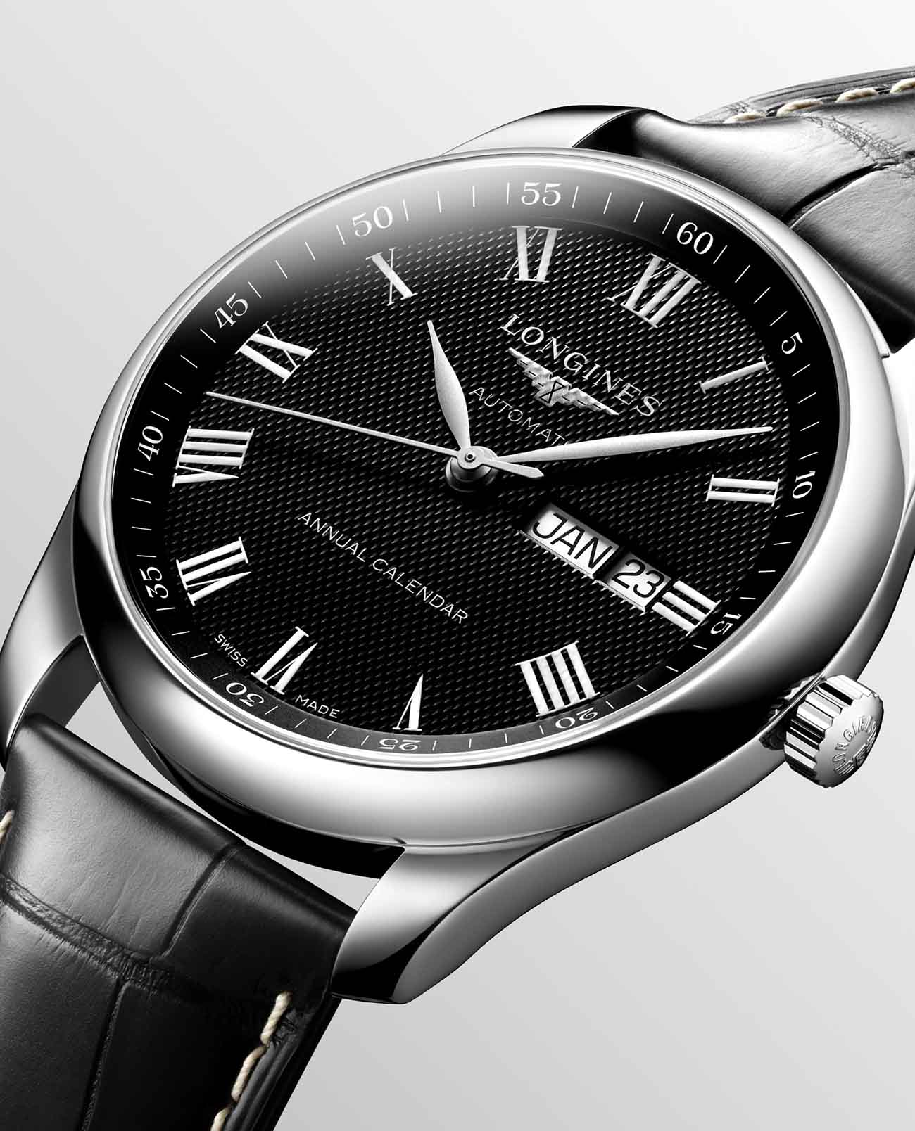 Римские цифры в сочетании с кожаным ремешком отражают элегантность. Внутри стального корпуса заключён швейцарский автоматический механизм L897, отличающийся 64-часовым запасом хода. Скелетонизированная задняя крышка с сапфировым стеклом позволяет отслеживать движение деталей и любоваться их отделкой. Годовой календарь включает указатели даты и дня недели.