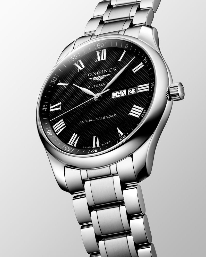 Римские цифры в сочетании с узорчатым циферблатом добавляют винтажности. Внутри стального корпуса заключён швейцарский автоматический механизм L897, отличающийся64-часовым запасом хода. Прозрачная задняя крышка с сапфировым стеклом позволяет отслеживать движение деталей и любоваться их отделкой. Годовой календарь включает указатели даты и дня недели.