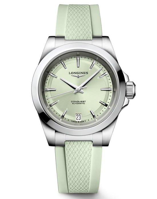 Женские швейцарские механические часы с автоподзаводом Longines Conquest L3.430.4.02.9. Сапфировое стеклоСапфировое стеклоПрочный и надёжный материал из кристалла сапфира синтетического происхождения, характеризующийся особой твёрдостью и устойчивостью к царапинам и повреждениям. устойчивое к появлению царапин, обладающее высокой прозрачностью. Корпус часов изготовлен из нержавеющей стали. Циферблат выполнен по технологии Sunray (солнечные лучи). Стрелки с люминесцентным покрытиемЛюминесцентное покрытиеПозволяет считывать показания времени в темноте. Производители наносят на стрелки, часовые индексы, безель или поверхность циферблата светонакопительный состав, дающий холодное свечение.. Окошко даты в положении 6 часов. Прозрачная задняя крышка. Класс водозащиты: 100 метров, позволит плавать, нырять и заниматься другими водными видами спорта. Браслет из каучука на раскладной застёжкеРаскладная застёжкаТакой тип застёжки используется только на браслетах из металла. Она никогда не раскрывается полностью, происходит разделение на 2 и более частей. Раскладывающая застёжка снизит вероятность потери часов к минимуму..